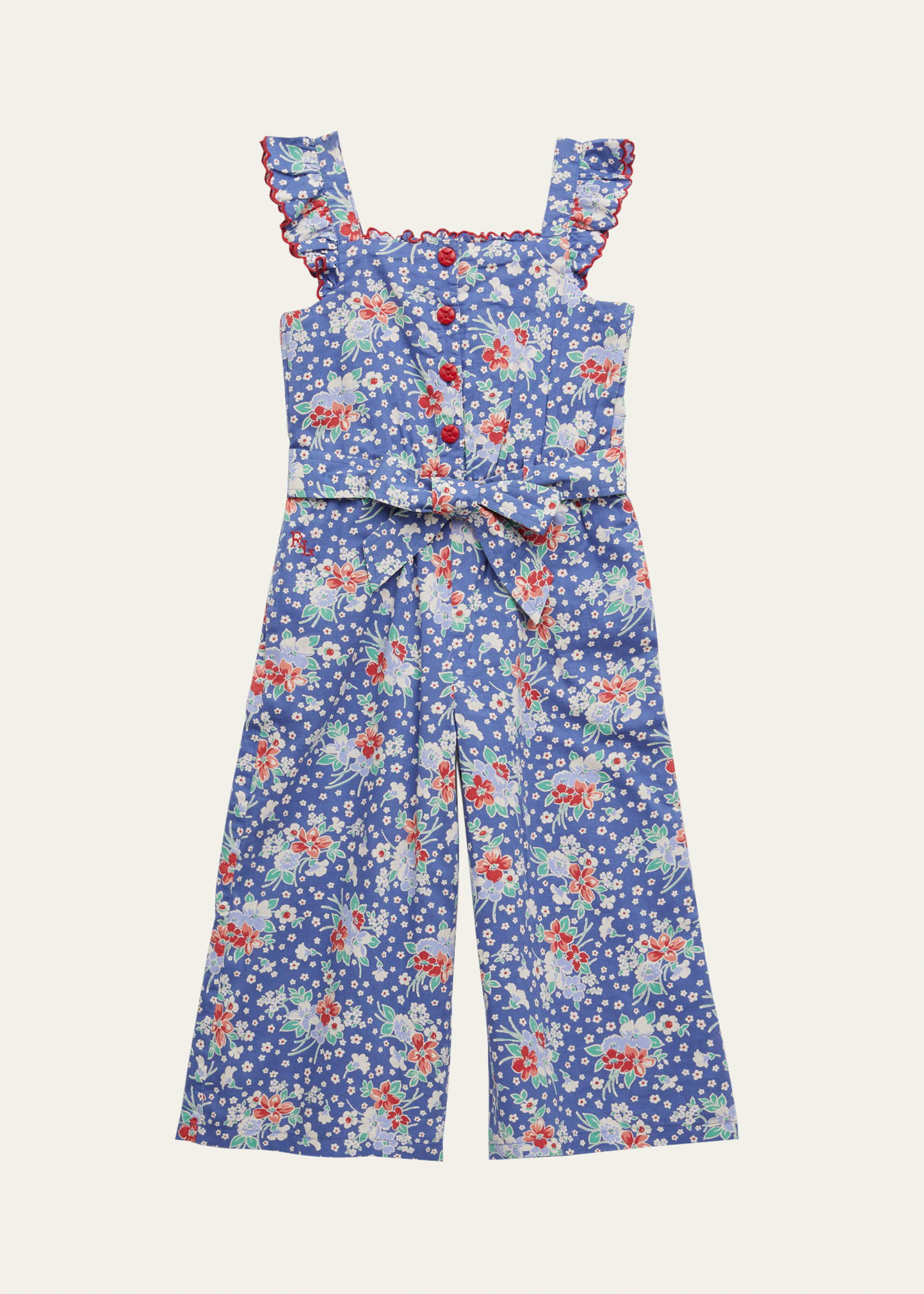 Ralph Lauren Childrenswear poplin jumpsuit in vibrant floral-print Square neckline Sleeveless Button front Self-tie waist Wide legs Ruffle trim Contrast trim Cotton Machine washable Imported