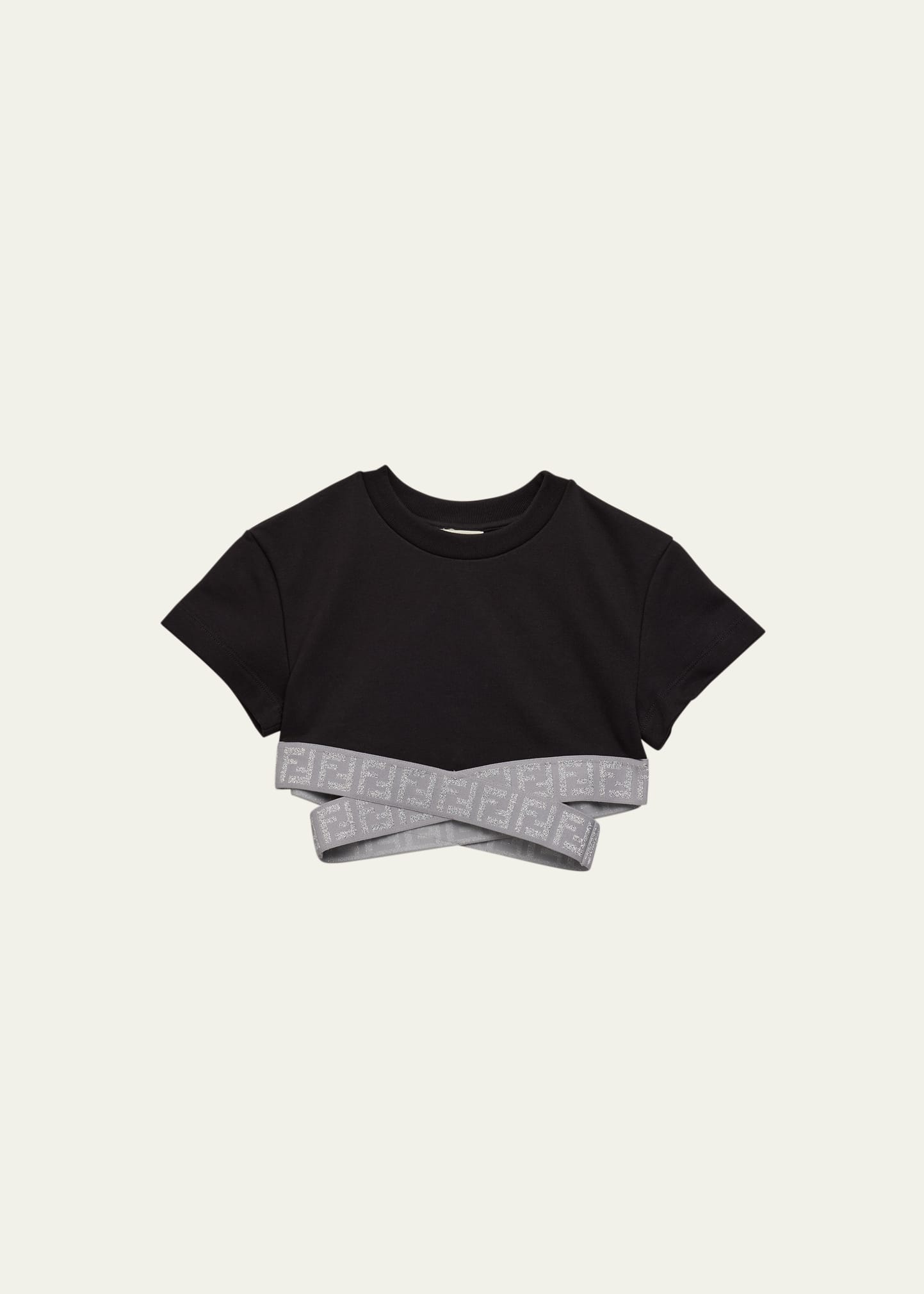 Girl cropped top with crisscross glittery monogram tape at hem Crew neckline Short sleeves Ribbed trim Pullover style Cotton Made in Portugal