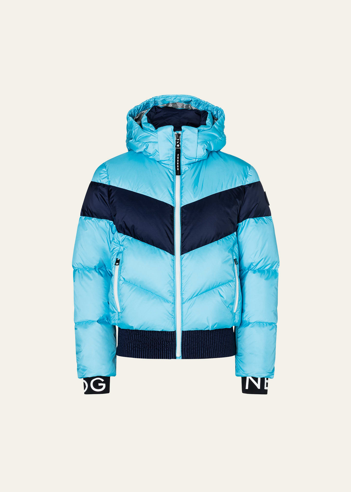 Bogner "Kira-D" 2-layer water-resistant ripstop ski jacket with contrast stripe Detachable hood with rainbow logo print; zip front Long sleeves with thumbhole cuffs Zip pockets; interior zip pocket; left sleeve pocket Ribbed hem Down/feather fill Polyamide Imported