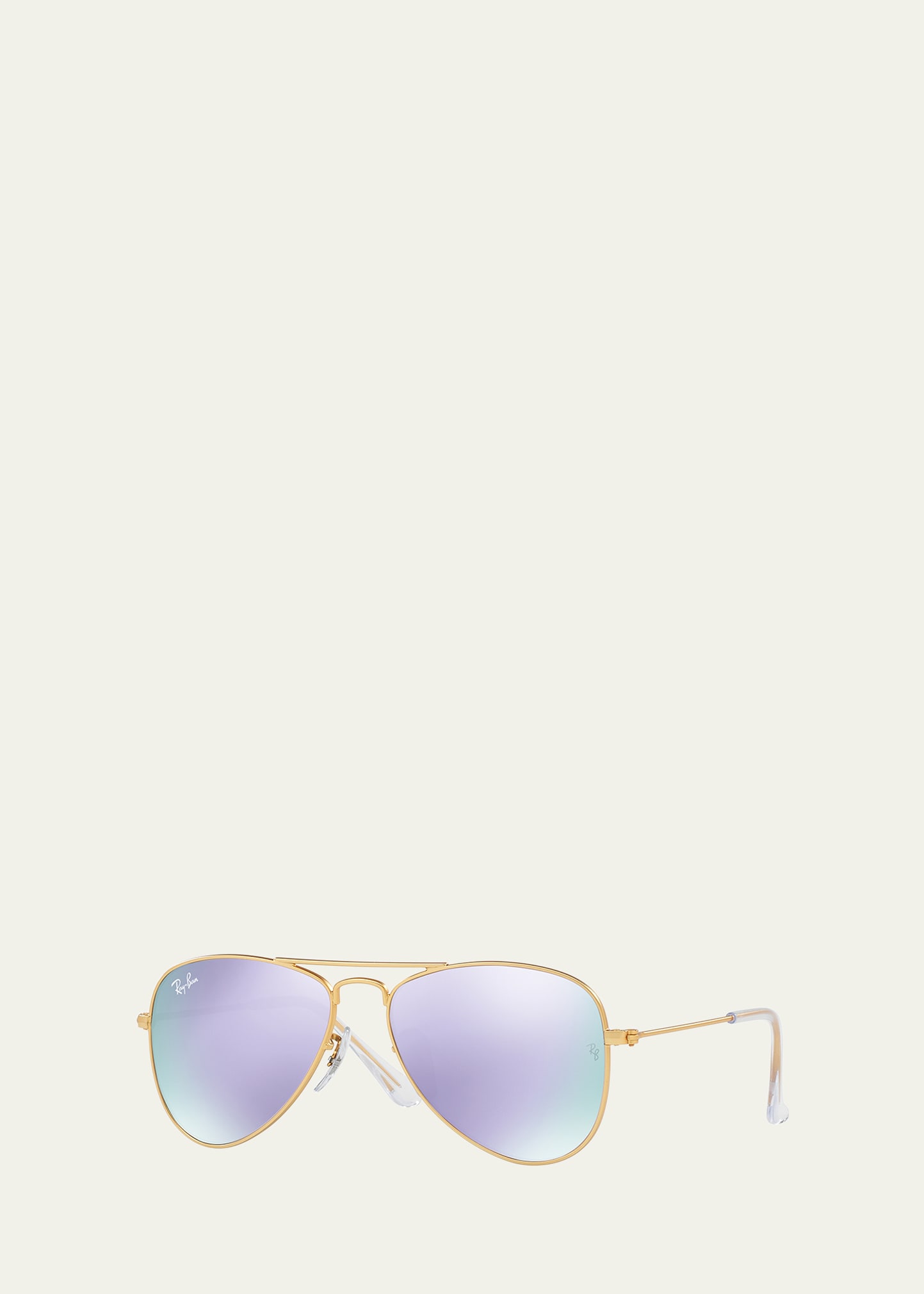 Ray-Ban Junior girl's aviator sunglasses in metal. Lens/bridge/temple (mm): 50-13-120. Mirrored lenses. Double nose bridge; straight brow. Capped earpieces. 100% UVA/UVB protection. Imported of Italian material.