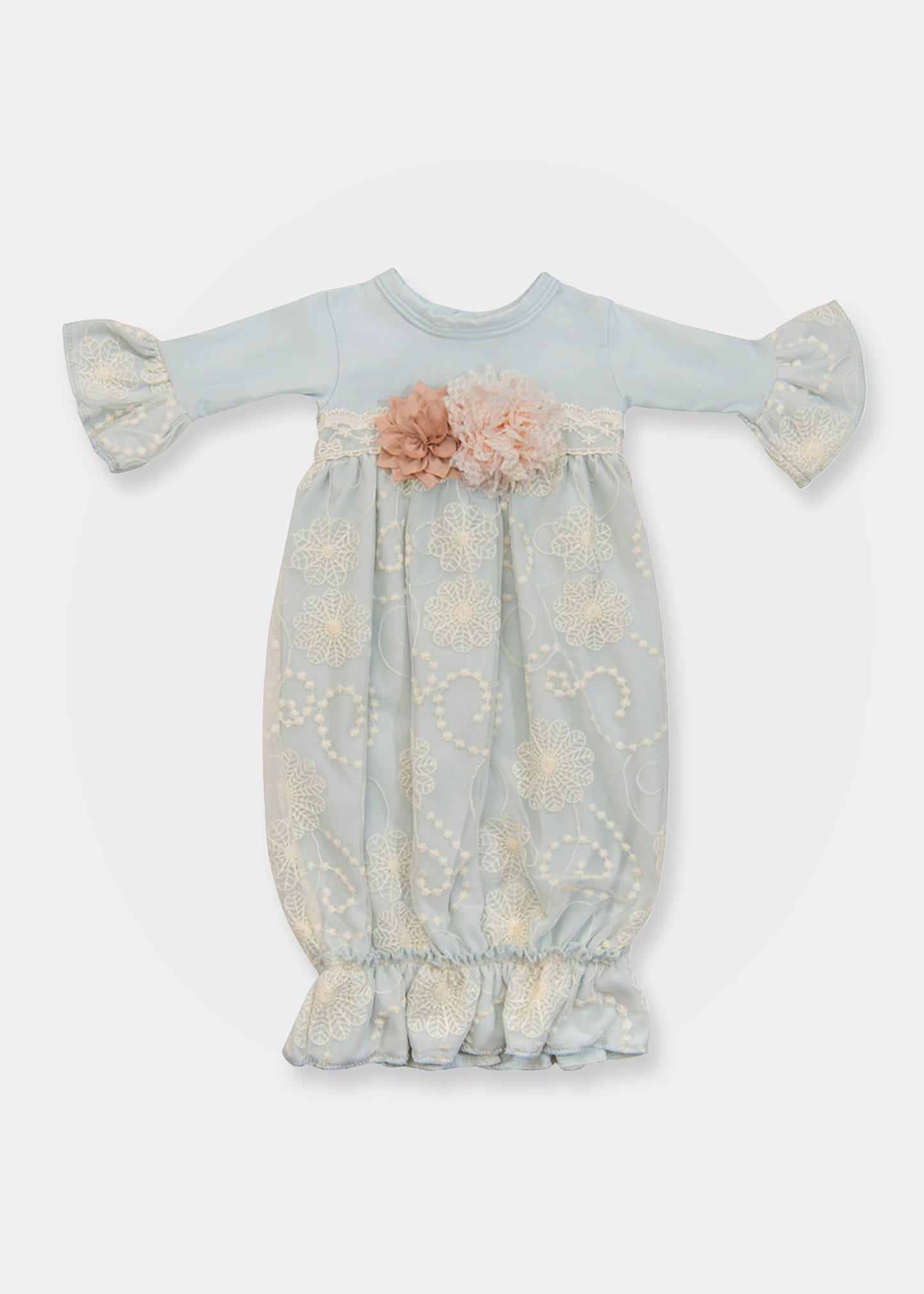 Haute Baby "Powder Fresh" gown with floral appliqués Round neckline Long sleeves Ruffle cuffs Lace trim at waist Elasticized hem Cotton Unlined Hand wash Made in USA