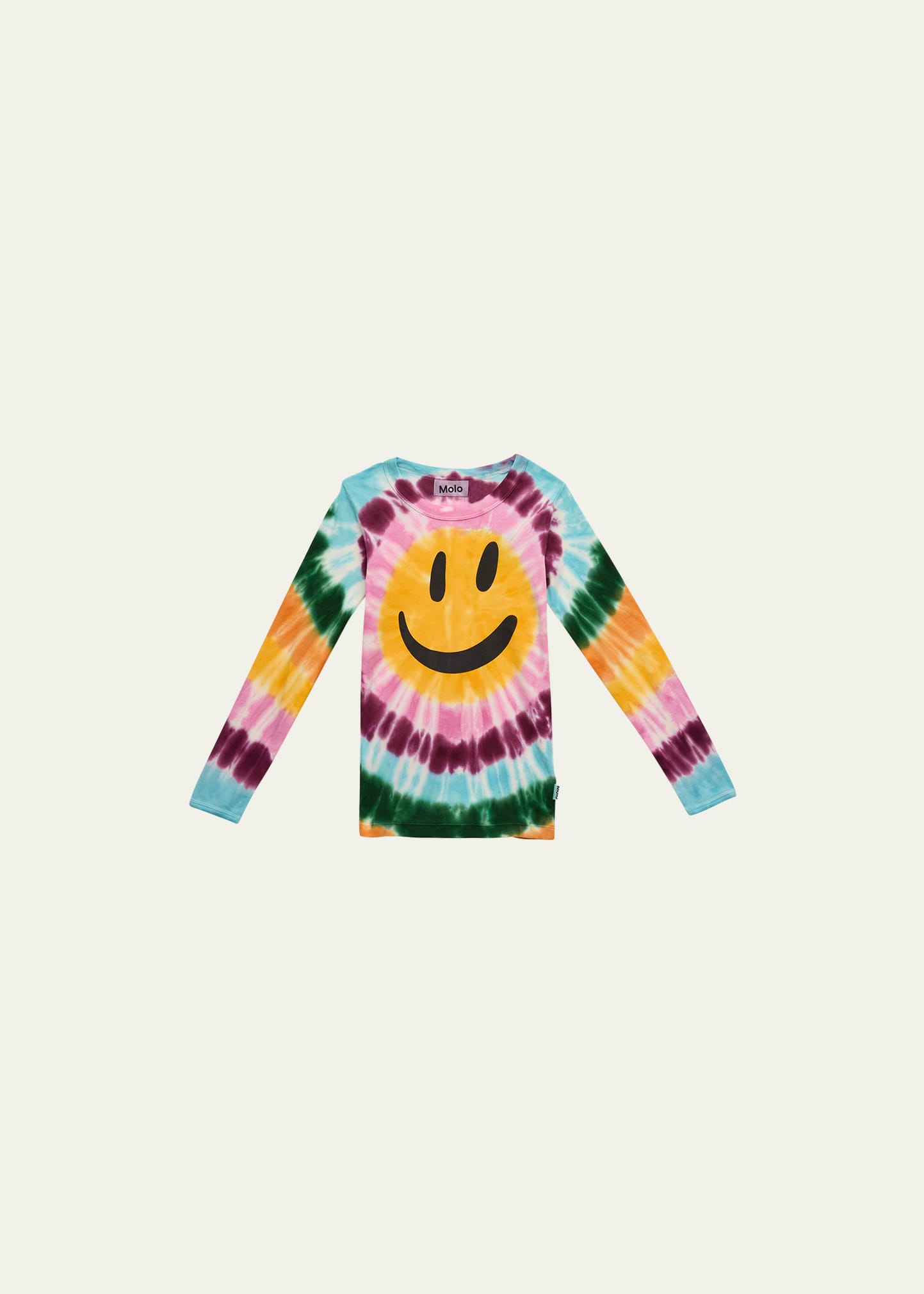 Molo "Reeta" tie dye T-shirt with signature happy face at front Round neckline Long sleeves Ribbed trim Pullover style This product is GOTS certified organic by Ecocert Greenlife, certification no. 197496 Organic cotton Imported