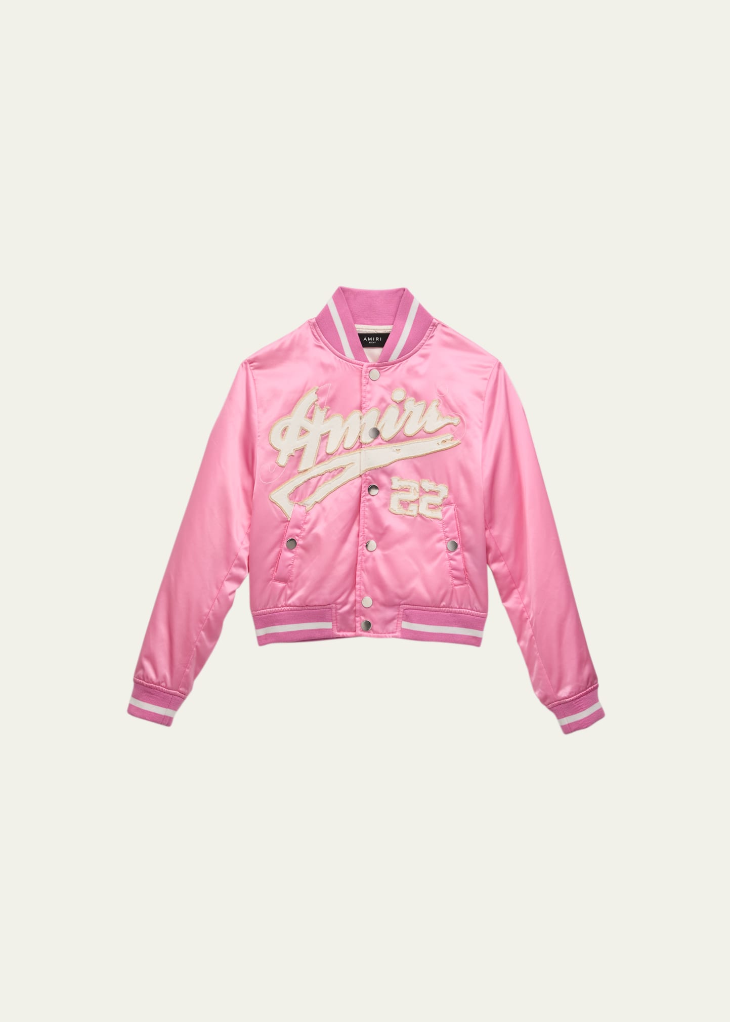 Amiri "Sateen" bomber jacket with logo embroidered at front Stand collar Long sleeves Full snap front Front welt pockets Banded cuffs and hem Ribbed trim Cotton/rayon Dry clean Made in Italy