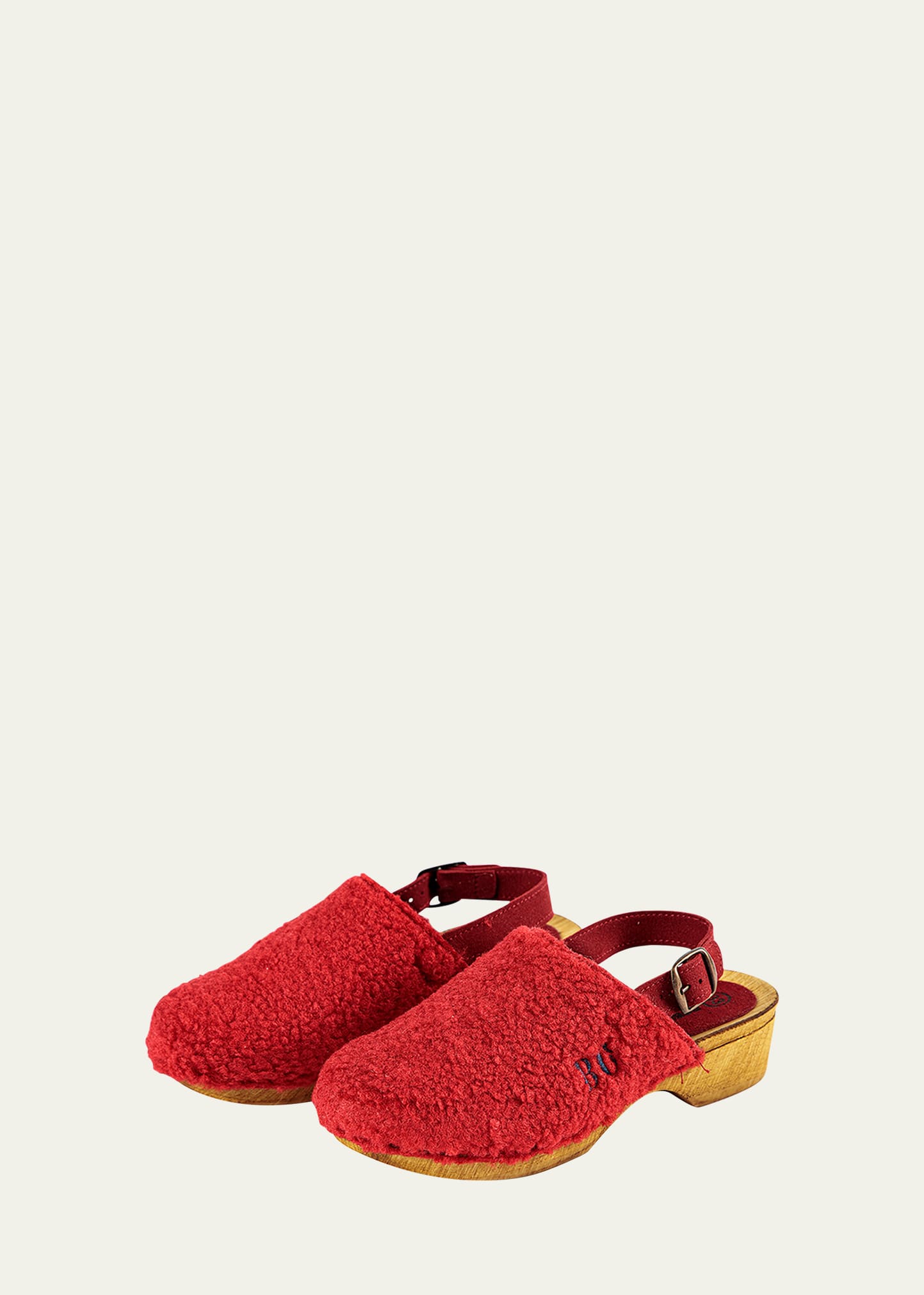 Bobo Choses sheepskin clogs with contrast embroidered logo-print Block heel Round toe Adjustable strap at back Exposed heel Made in Spain