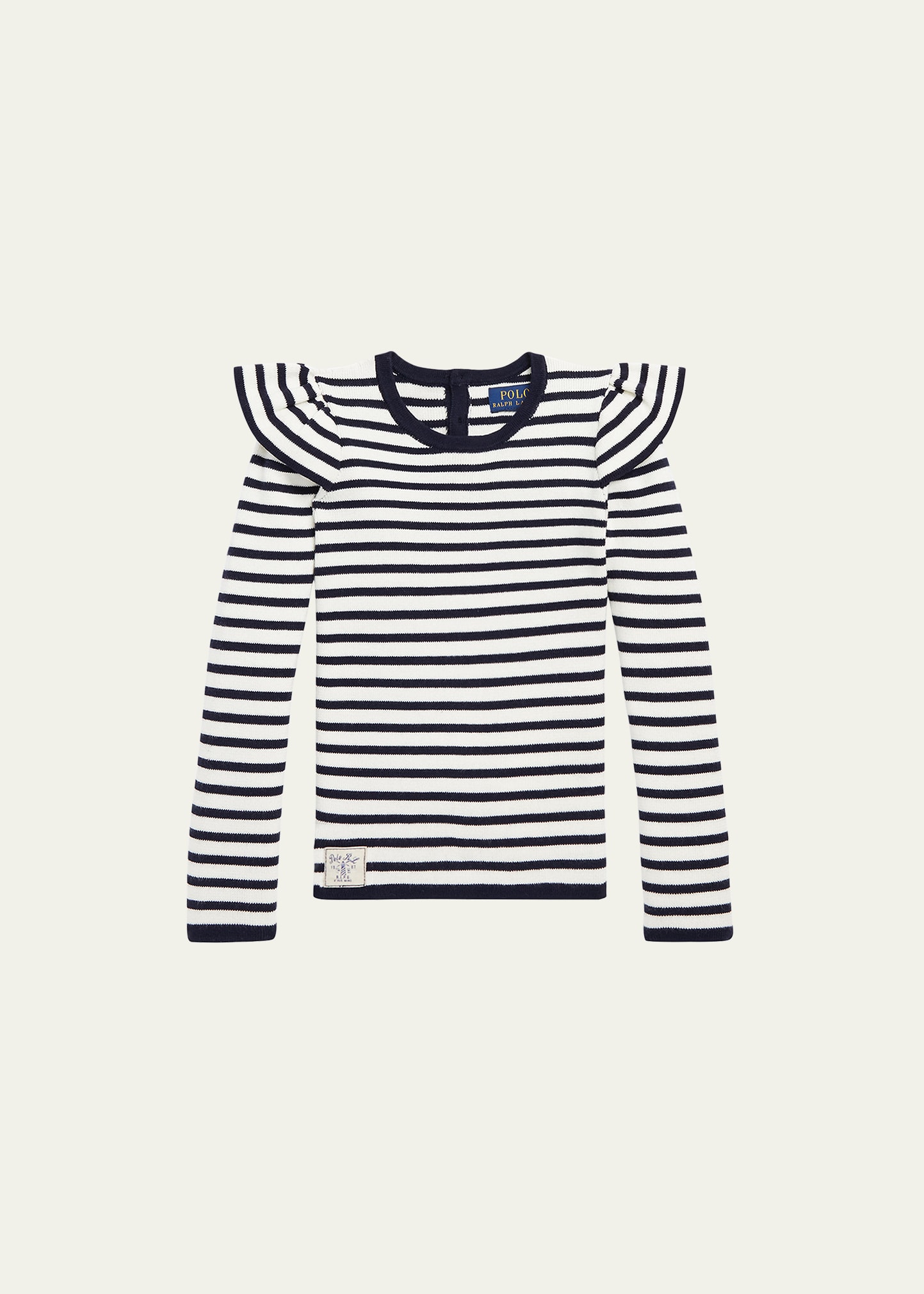 Ralph Lauren Childrenswear nautical-inspired striped ruffle trim sweater Round neckline Long sleeves Contrast trim Pullover style Machine washable Cotton Imported