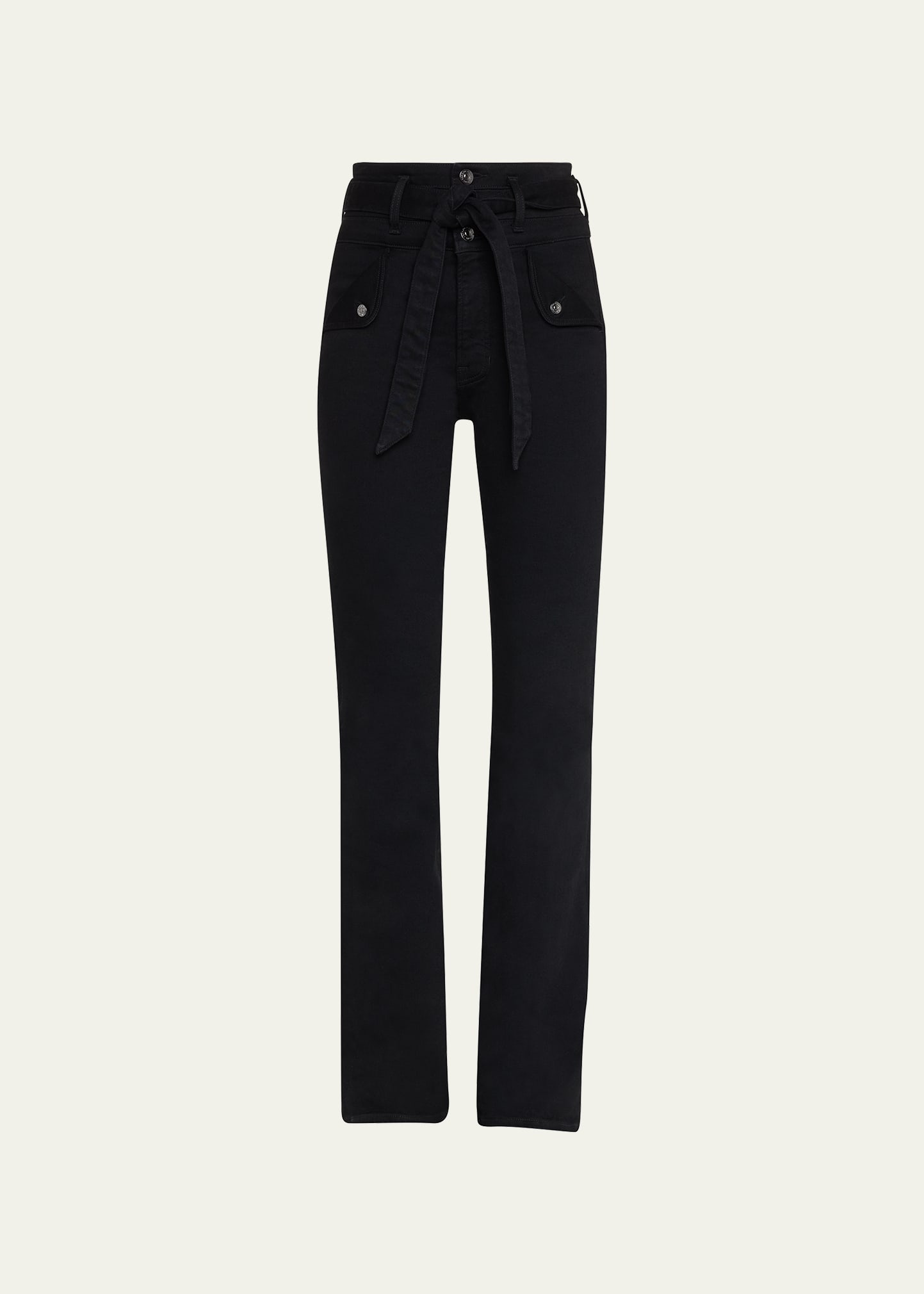 Veronica Beard "Giselle" skinny flared jeans with a belted waist in black denim Four-pocket style High rise Slim fit Full length Button/ zip fly; belt loops Cotton/elastane Dry clean Made in USA