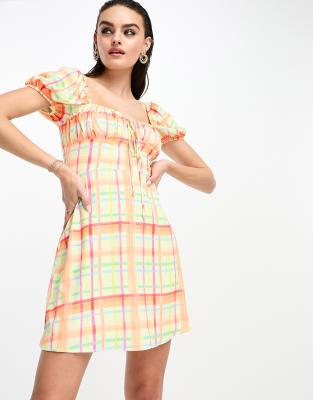 Dresses by Glamorous Summer, styled Sweetheart neck Puff sleeves Tie front Zip-back fastening Regular fit