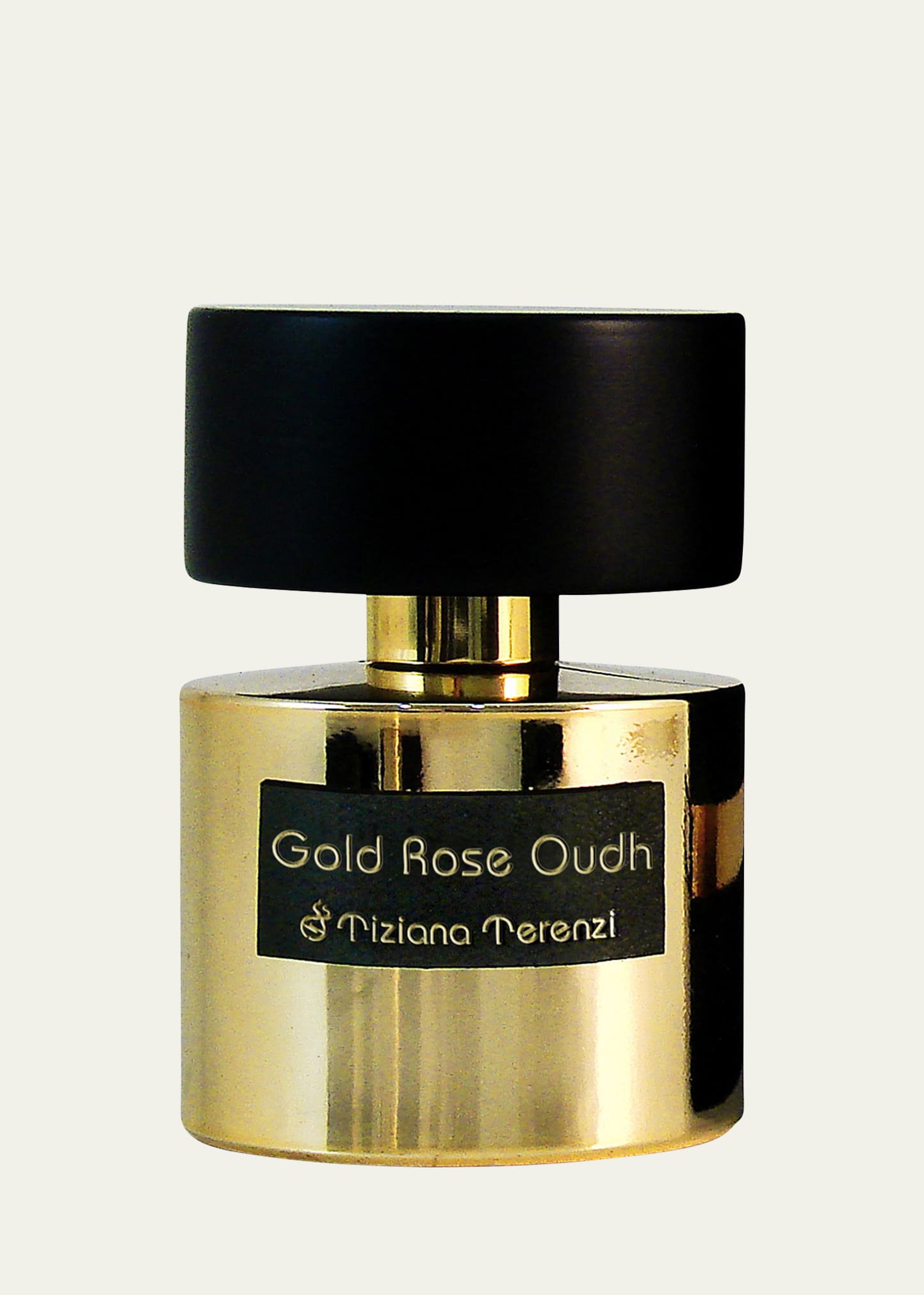 Tiziana Terenzi Gold Rose Oudh Extrait de Parfum, 3.4 oz. Gold Rose Oudh is inspired by the mysterious solitude and wilderness of a fire in the desert. This warm, seductive and enveloping scent is infused with luscious rose, amber accords and the opulent, deep sensual notes of oud. Top: bergamot, fir, amber, sand Heart: Bulgarian rose, patchouli, black pepper Base: oud, amber, sandalwood, musk, honey 3.4 oz / 100 mLDesigner About Tiziana Terenzi: A third-generation Italian candle and perfume.