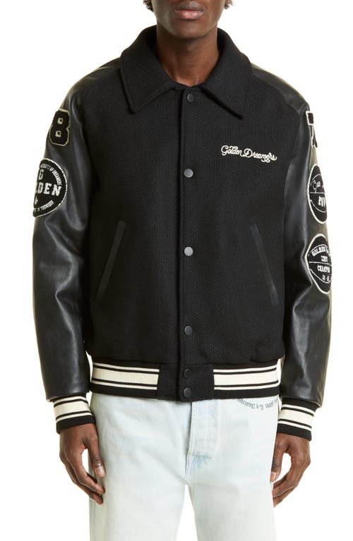 Dream-team vibes radiate from this jacket styled with leather raglan sleeves and lots of varsity-level brand iconography by way of patches and partial stars. Front snap closure Spread collar Front slant pockets Ribbed cuffs and hem Cotton lining 100% virgin wool with leather and 100% polyester and 50% acrylic, 50% wool contrasts Professional leather clean Made in Italy Men's Designer Clothing