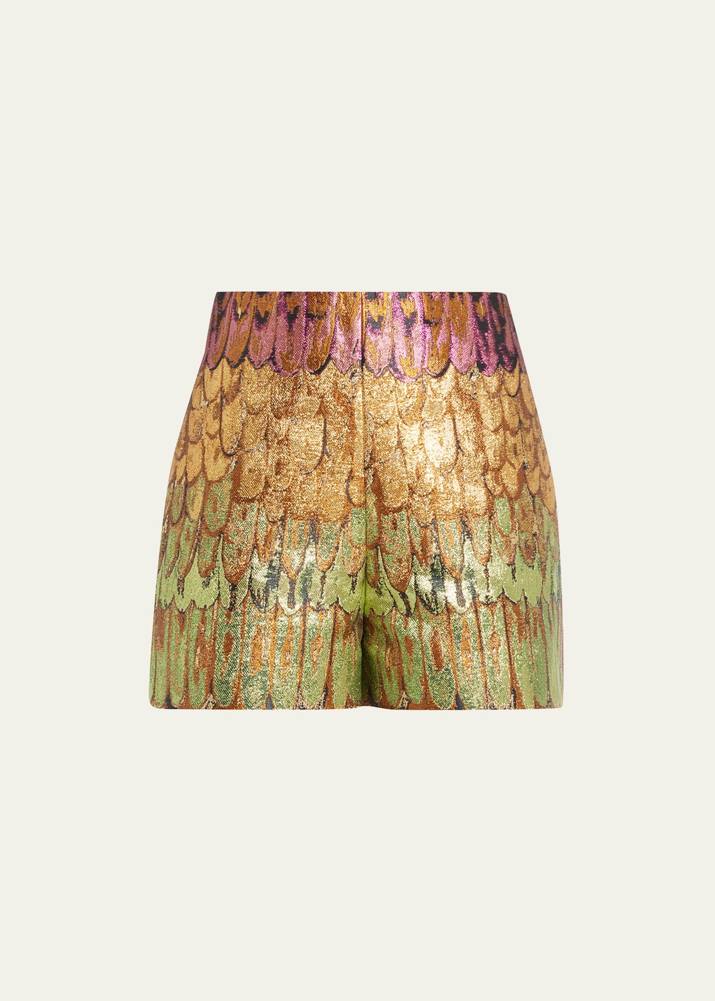 Valentino brocade shorts in golden wings motif High rise Straight legs Mid-thigh length Polyester/polyamide Silk lining Made in Italy