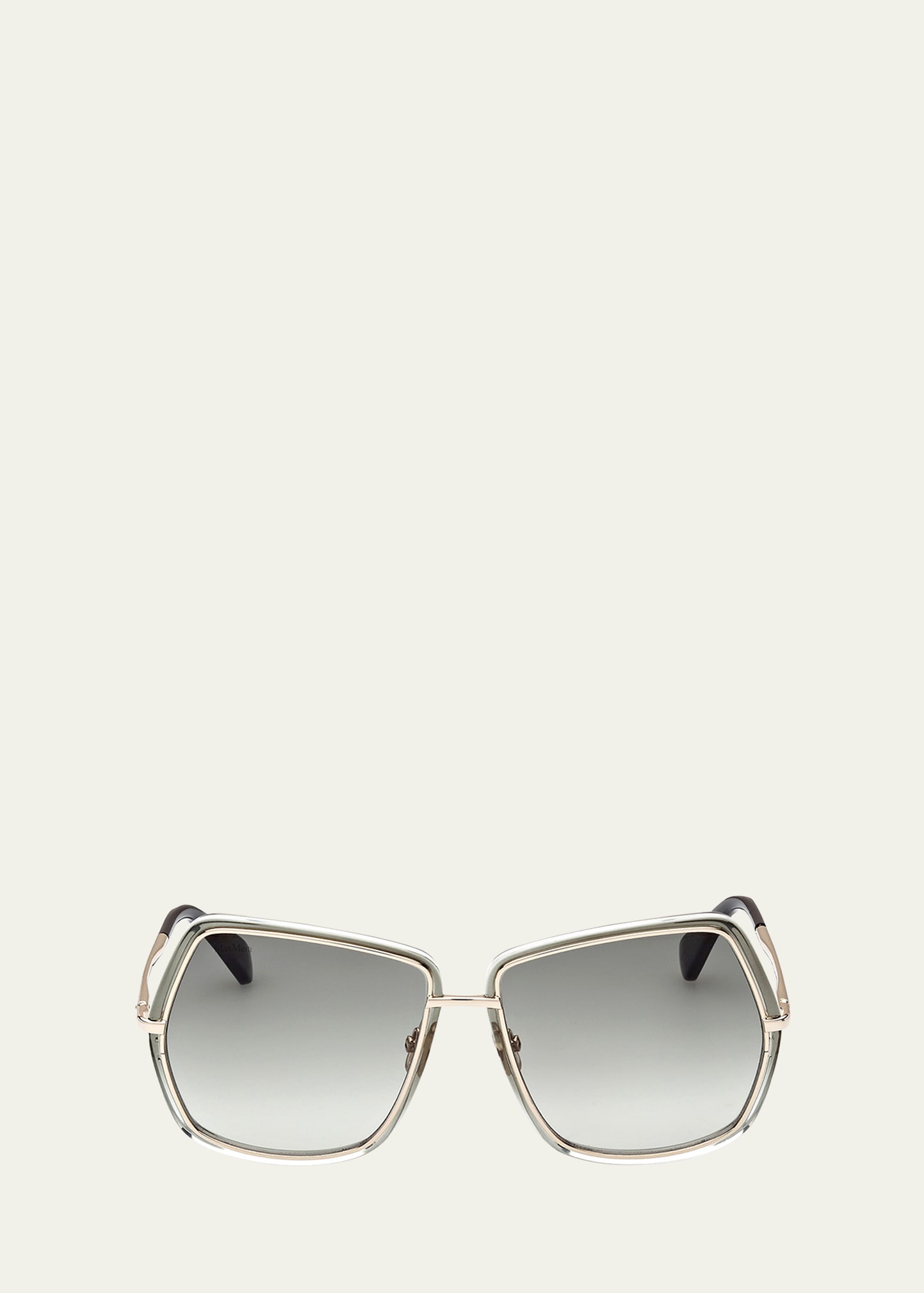 Max Mara geometric butterfly sunglasses in metal Lens/bridge/temple (in mm): 64-12-135 Gradient lenses with logo script on side Open nose bridge Adjustable nose pads Engraved logo on temples Thin, tapered arms Capped earpieces 100% UVA/UVB protection Imported