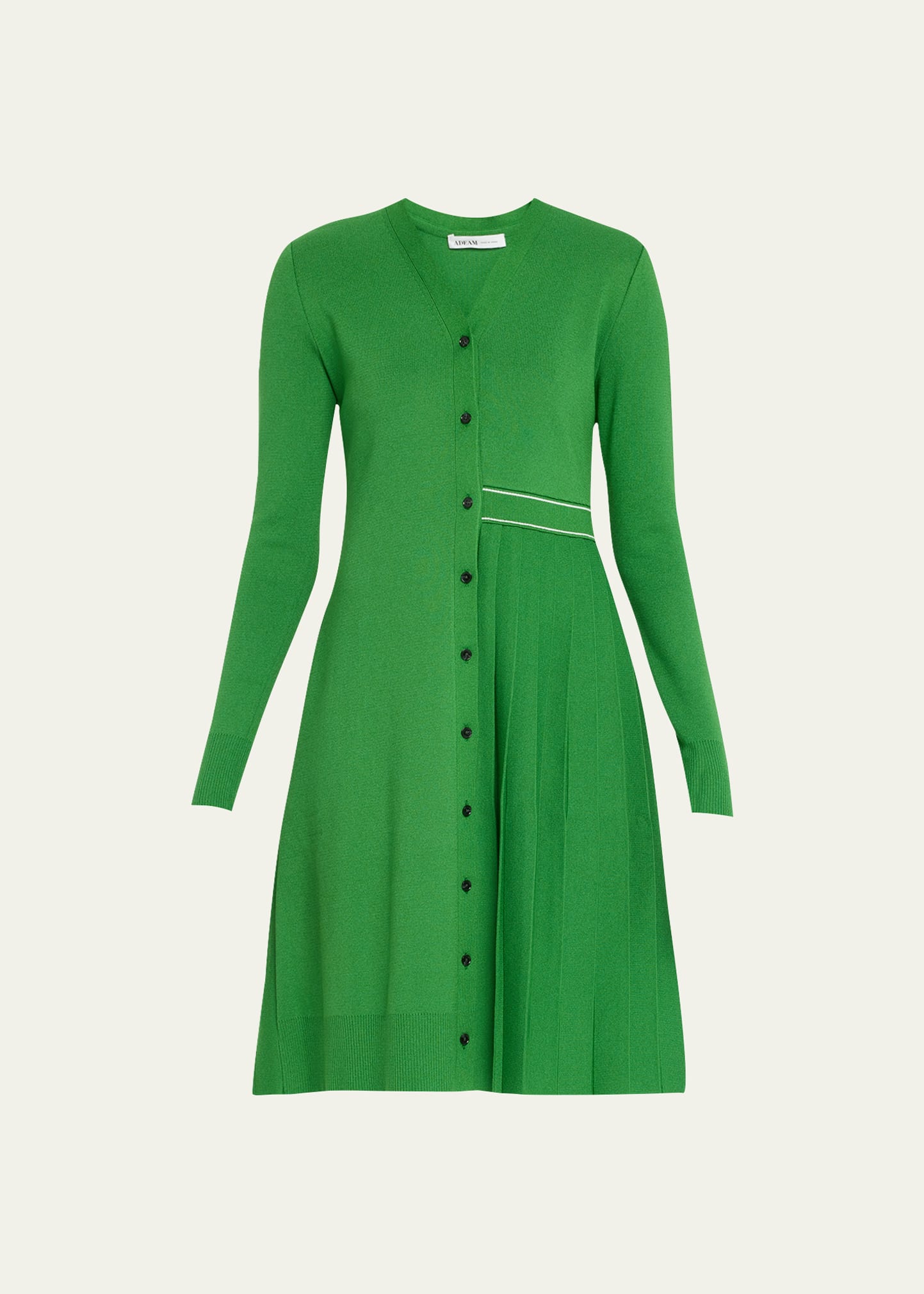 ADEAM "Graf" knit cardigan dress with logo intarsia on waist and pleated skirt V neckline; button front Long sleeves Side slip pockets A-line silhouette Knee length Rayon/polyester Made in Japan