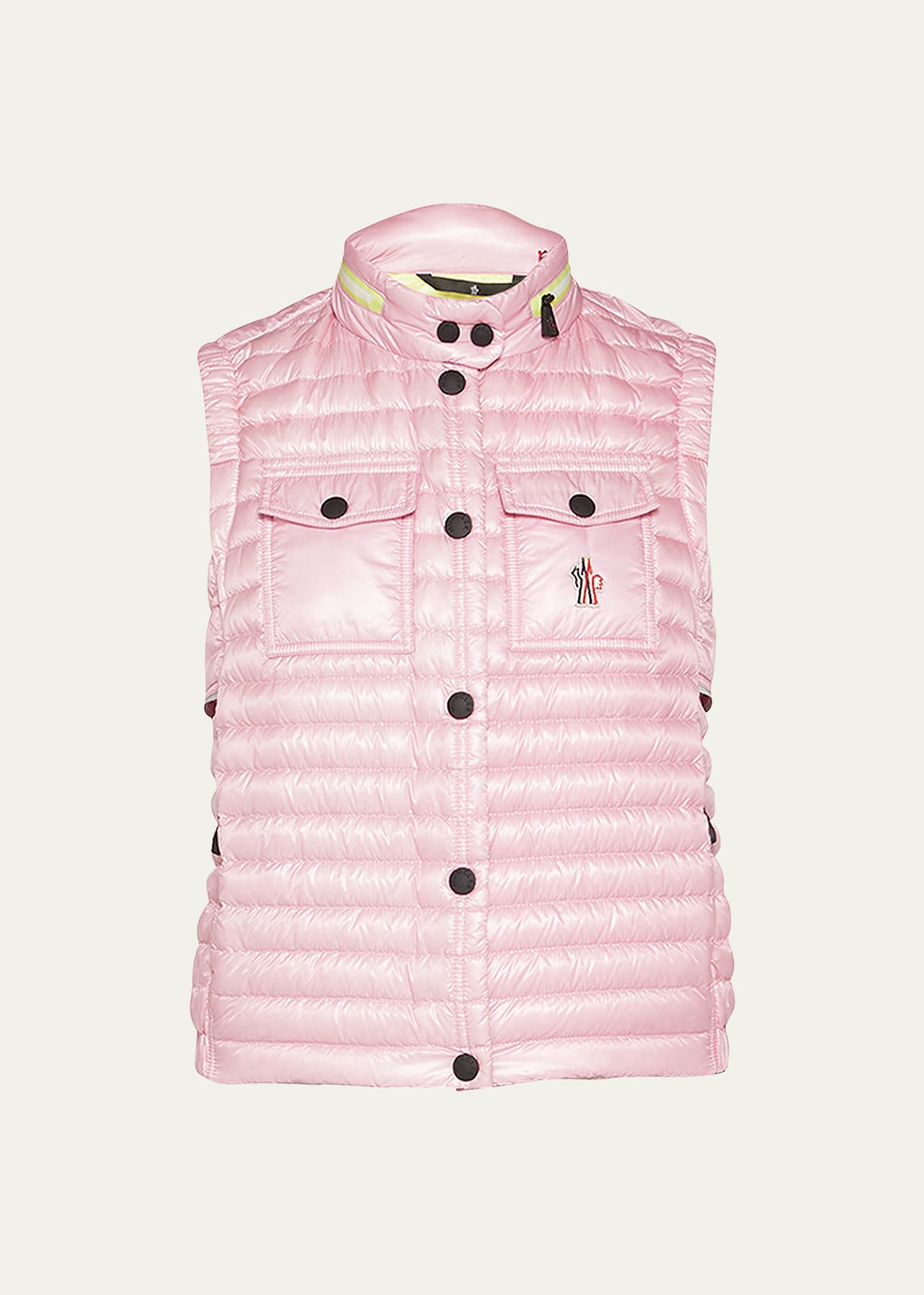 Moncler Grenoble "Gumiane" vest with a puffer styling Stand collar; optional hood Two-way front zip; snap placket covered Sleeveless Front patch pockets; logo embroidery Hip length Nylon Feather/down fill Dry clean Made in Romania