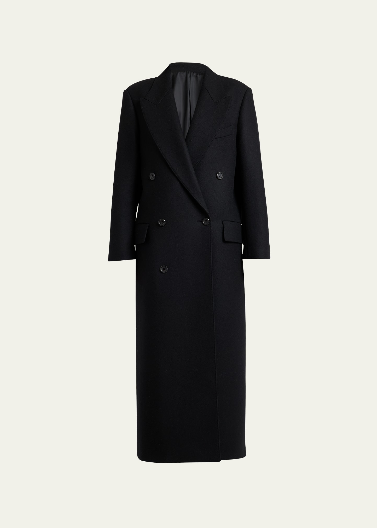 ARMARIUM "Hadi" cashmere-blend long trench coat Double-breasted front Peak lapel collar Two-row button front Long sleeves Front ticket pocket; side flap pockets Back center slit Knee length Relaxed fit Wool/cashmere Lining: Cupro Made in Italy