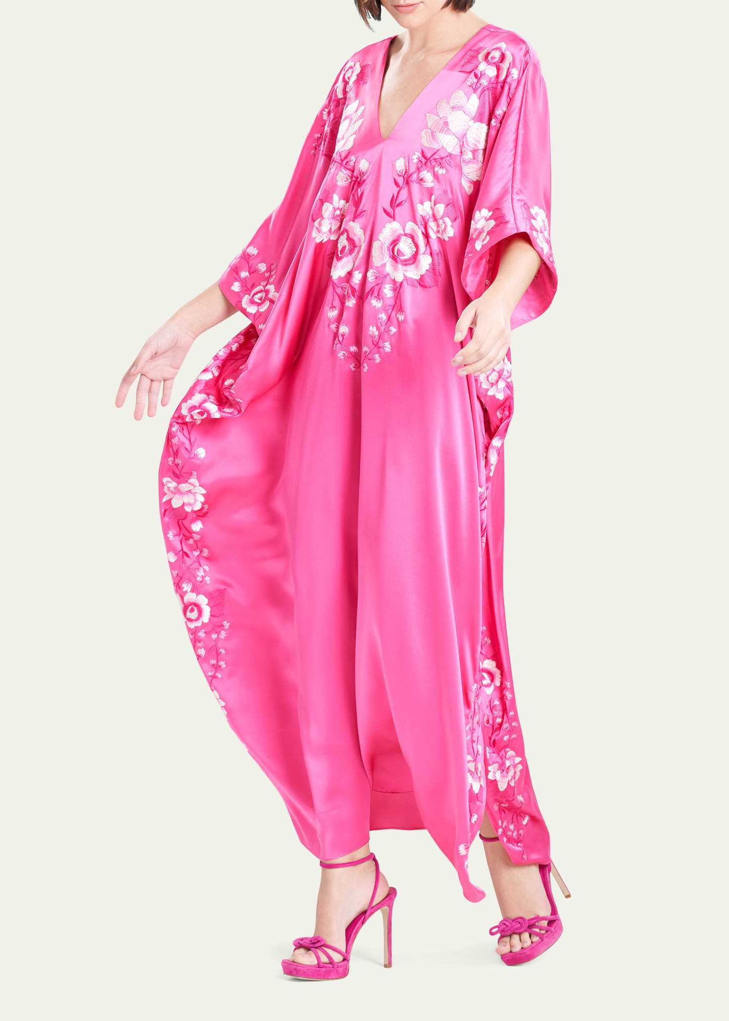 Josie Natori "Hanabi" silk charmeuse couture caftan with floral embroidery Approx. 55"L from shoulders to hem V neckline 3/4 dolman sleeves Hem side slits Full length Shift silhouette Slipover style Silk Dry clean Imported