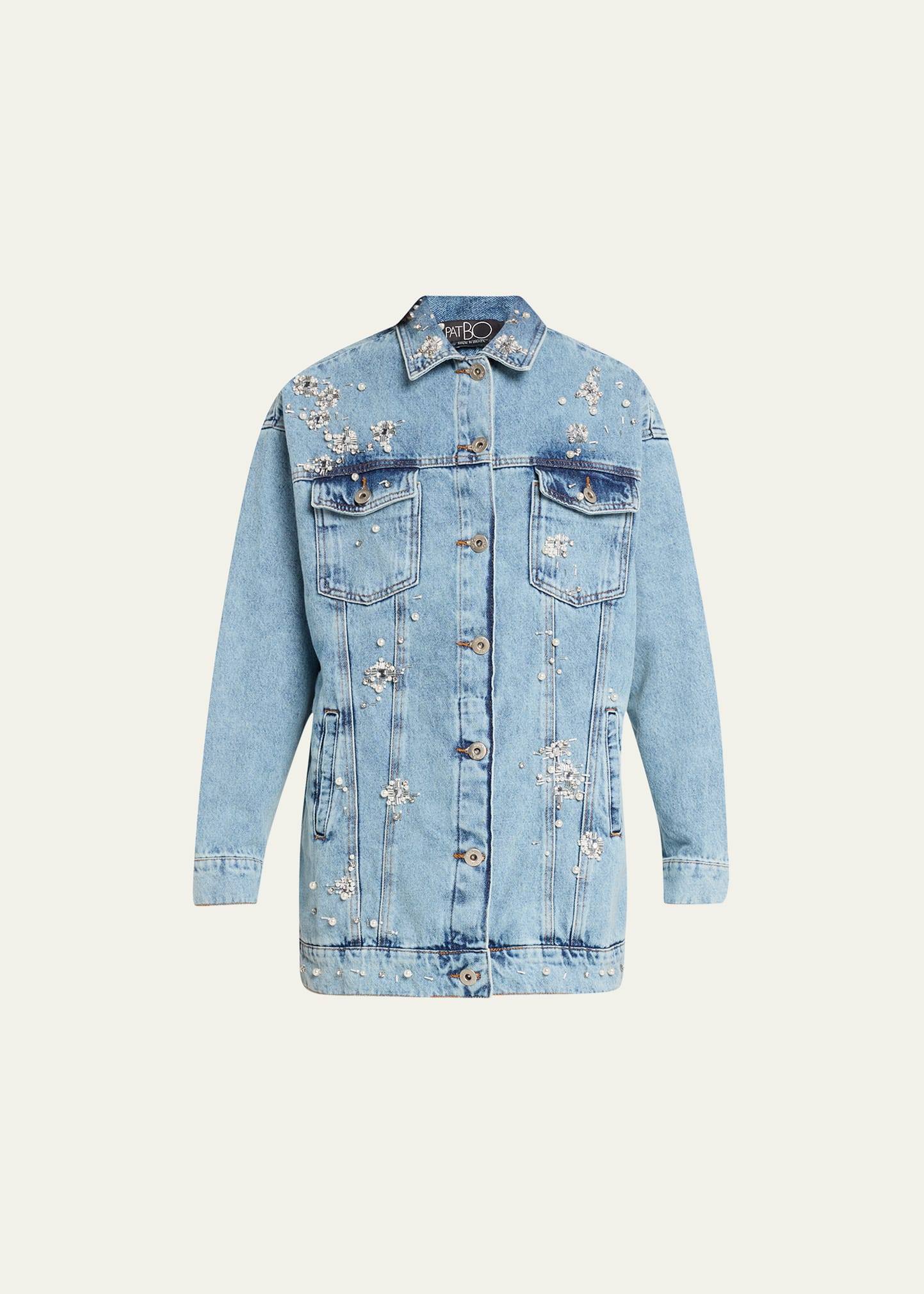 PatBO handmade denim jacket scattered with rhinestone beadwork Approx. 27"L from shoulder to hem Spread collar; button front Long sleeves with button cuffs; approx. 26.0"L Front flap pockets; side entry pockets Cinched waist Oversized fit Hits below the hips Cotton Hand wash Made in Brazil