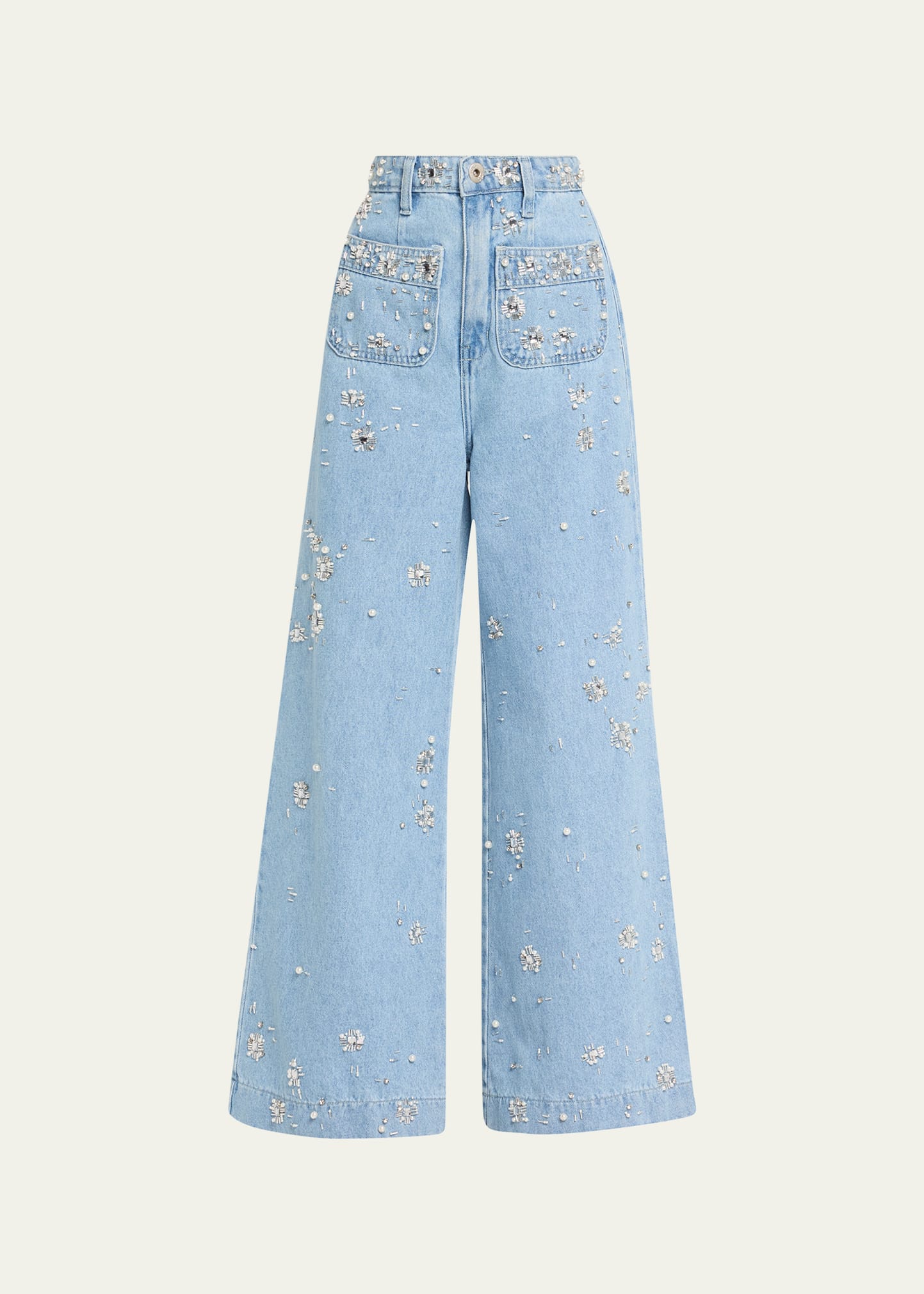 PatBO denim jeans hand-embellished with rhinestone clusters on the front and waistband Approx. measurements: 32.0" rise; 32" inseam High rise Front patch pockets Wide legs Full length Button/zip fly; belt loops Cotton Hand wash Made in Brazil