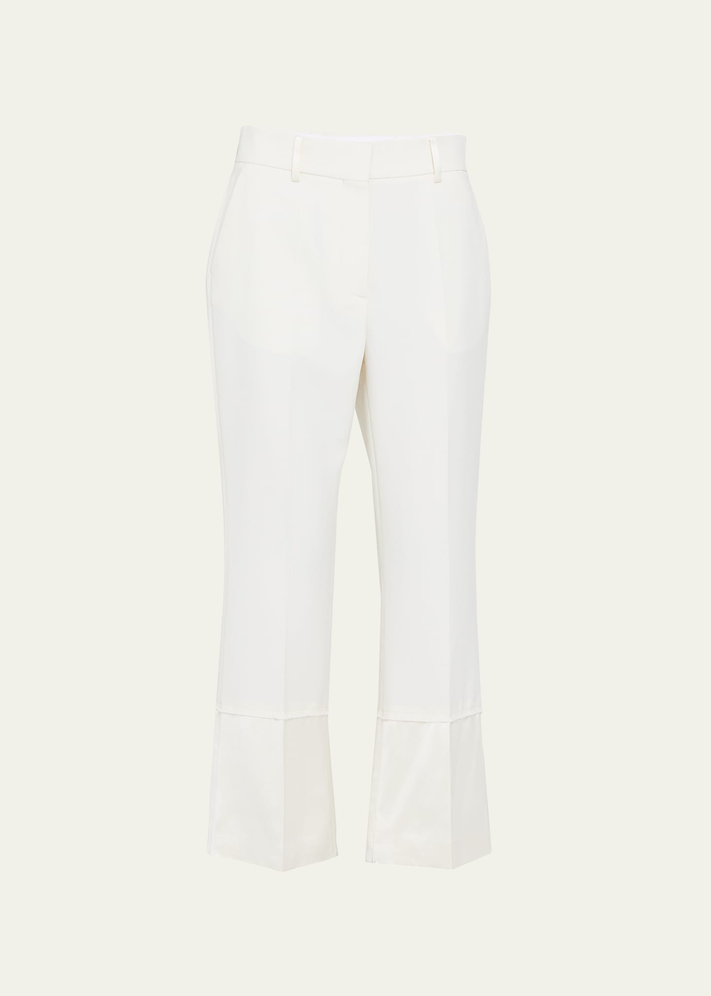 Wales Bonner "Harmony" solid trousers Mid rise Flat front Side slip pockets; back welt pocket Straight legs Cropped fit Tab/zip fly; belt loops Virgin wool/viscose Cupro lining Made in Italy