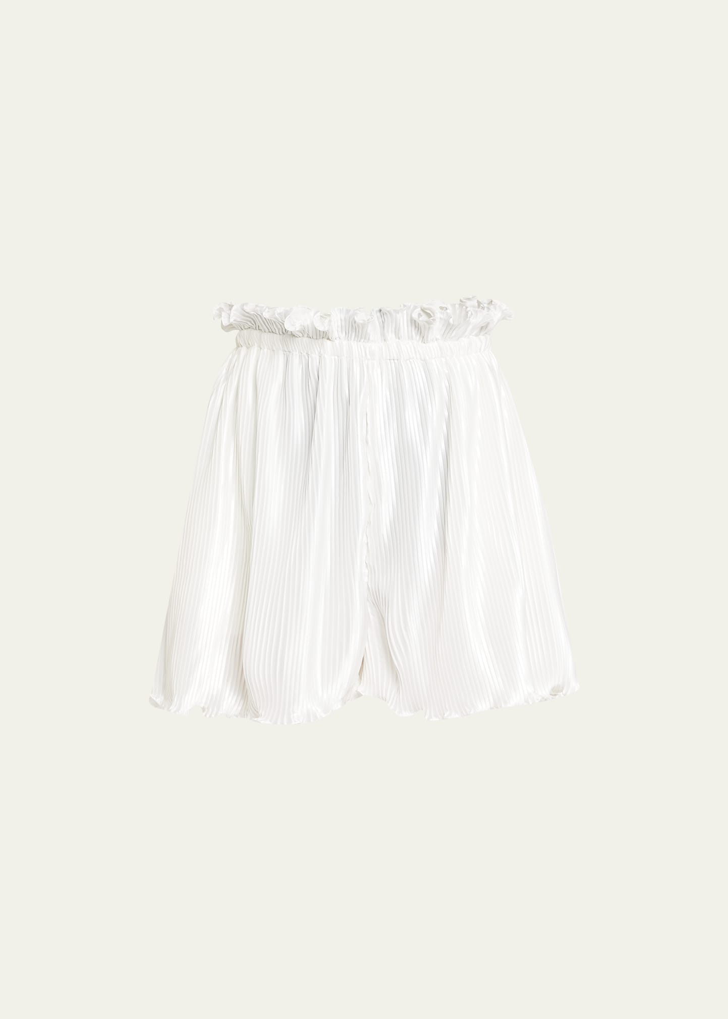 Verandah satin shorts finished with allover knife pleating High-rise paperbag waistband Relaxed legs Pull-on style Viscose Imported