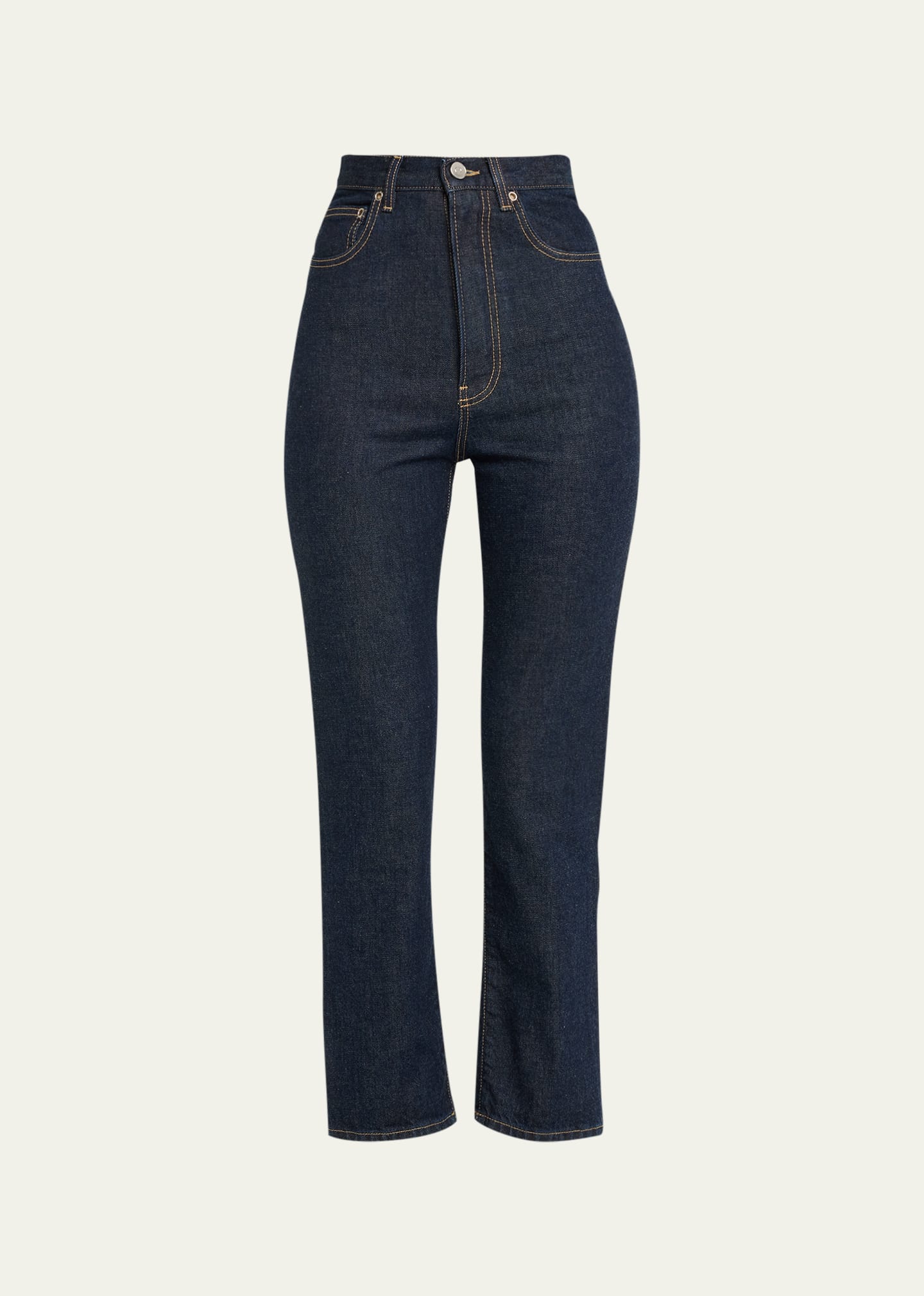 ALAIA raw denim jeans with gathered stitch detailing at back High rise Button/zip fly Five-pocket style Straight legs Full length Cotton Lining: Polyester Made in Italy