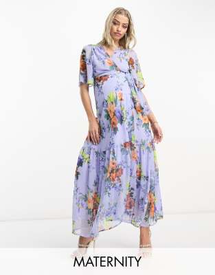 Hope & Ivy Maternity flutter sleeve wrap midaxi dress in lilac floral-Purple