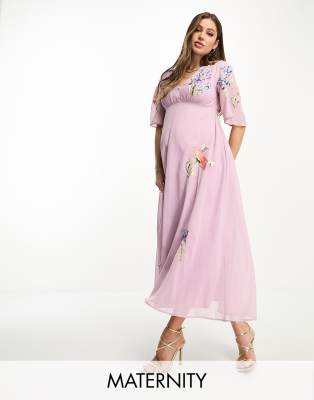 Hope & Ivy Maternity plunge front embroidered maxi dress in lilac-Purple