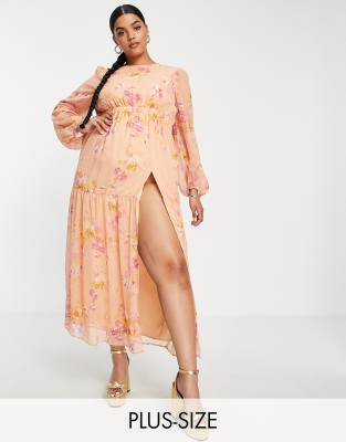 Hope & Ivy Plus cut-out balloon sleeve maxi dress in peach and ochre floral-White
