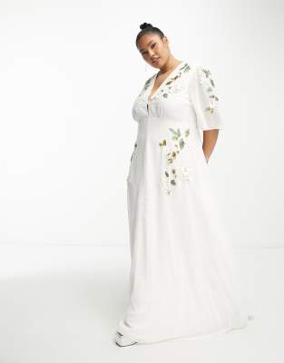 Hope & Ivy Plus embellished plunge flutter sleeve maxi dress in cream-White