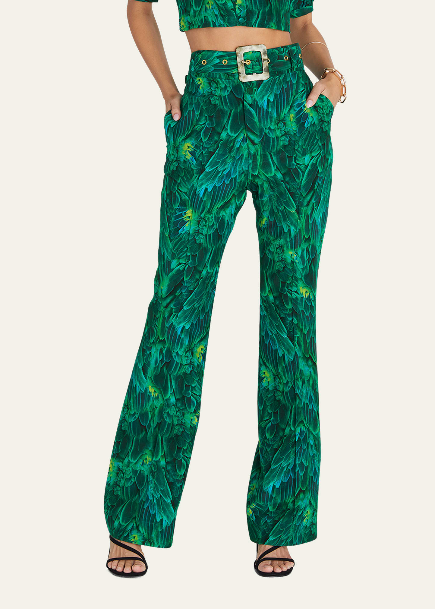 Aqua Blu Australia "Victoria" pants in eye-catching Hummingbird print High rise Flat front Side slant pockets; back welt pockets Removable, adjustable tortoiseshell belt Full length Flared legs Button/zip fly; belt loops Cotton/silk Imported