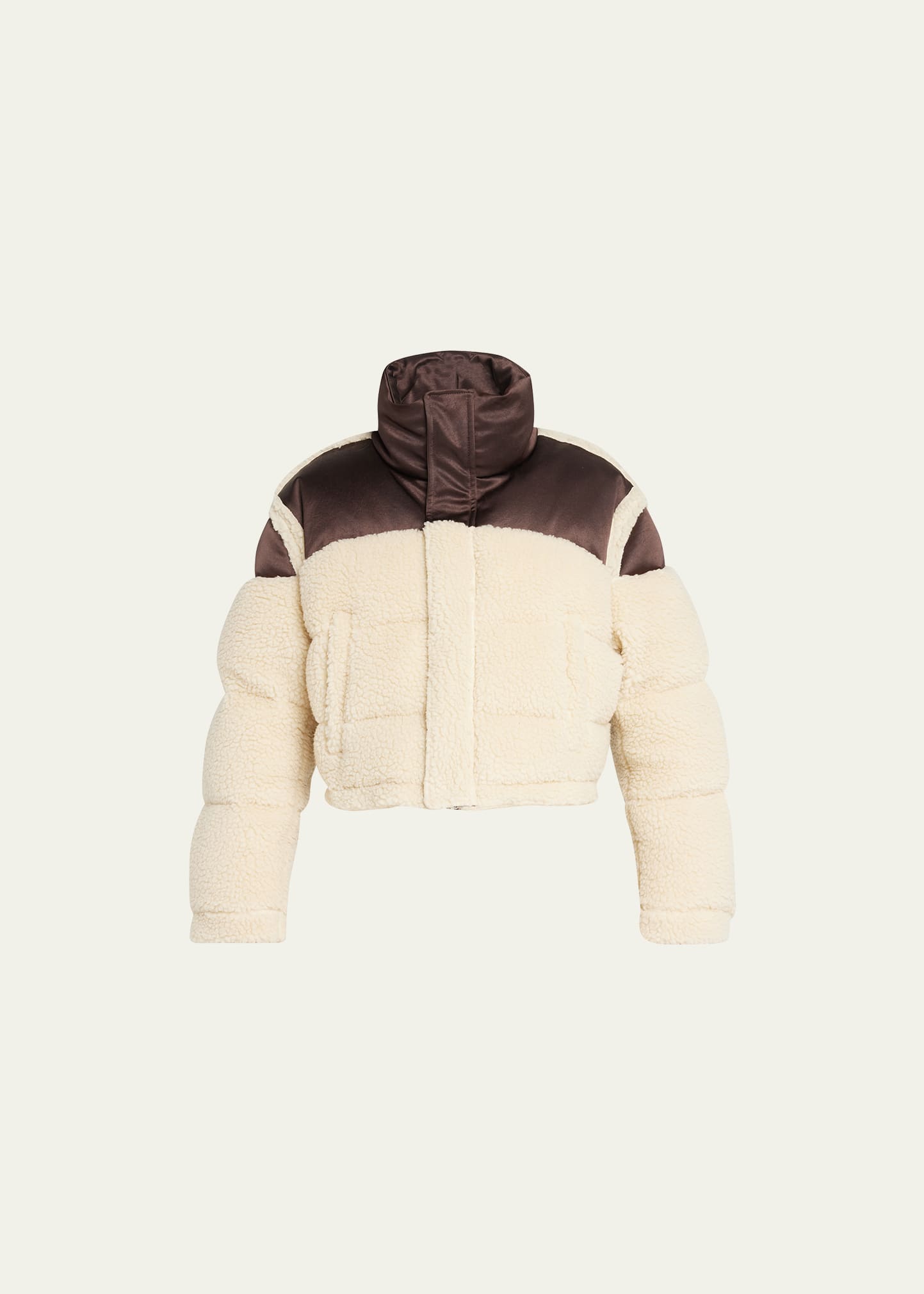 Amiri suede hybrid track jacket with natural and dyed calf hair (Italy) combo and embroidered monogram on chest Stand collar; zip front Long sleeves Side pockets Relaxed fit Drawcord hem Polyester fill Dry clean Made in Italy