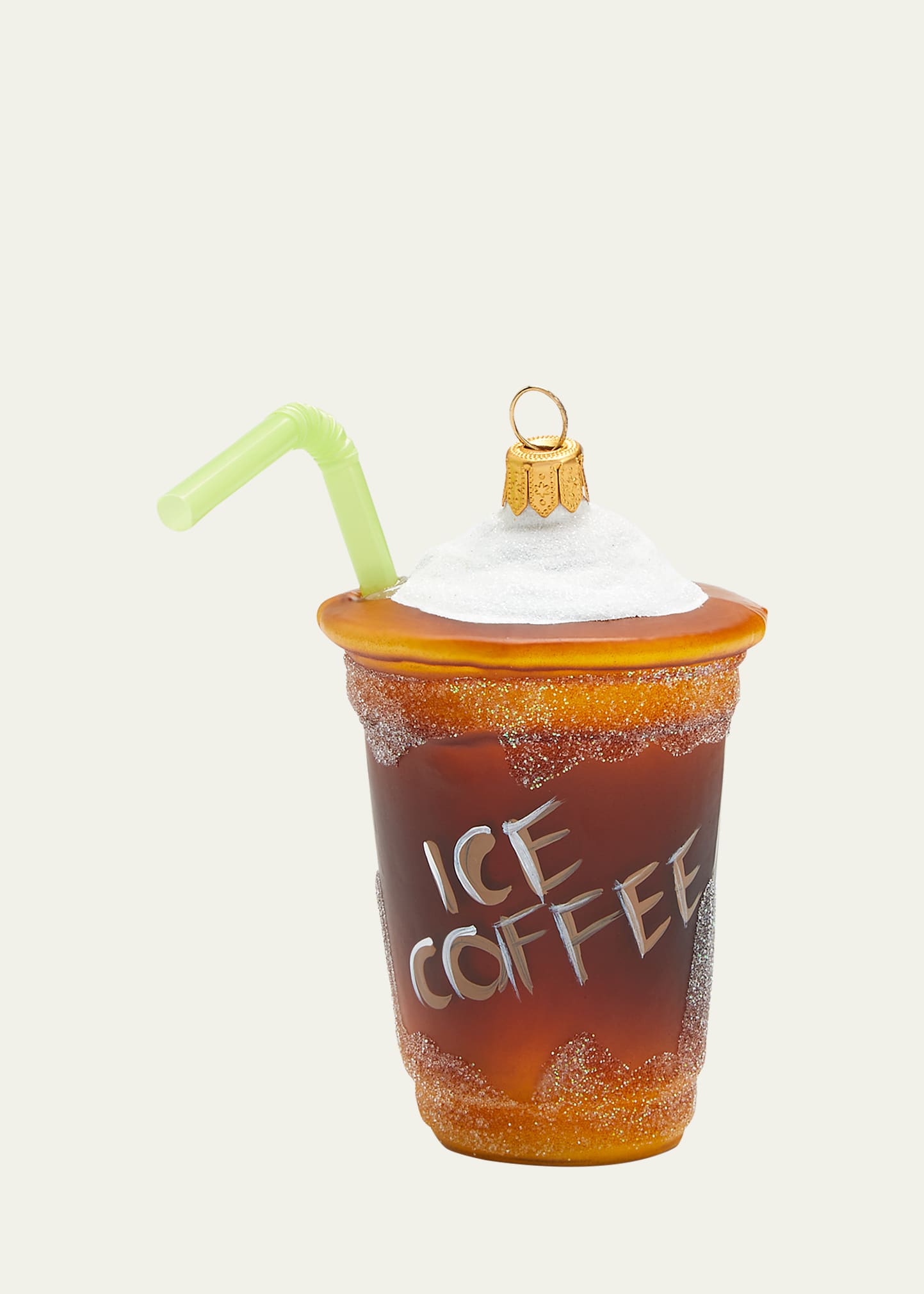 Hand-decorated Christmas ornament features a cup of iced coffee Handcrafted of mouth-blown glass Approx. 2.3"W x 2"D x 3.7"T Wipe clean Made in Poland