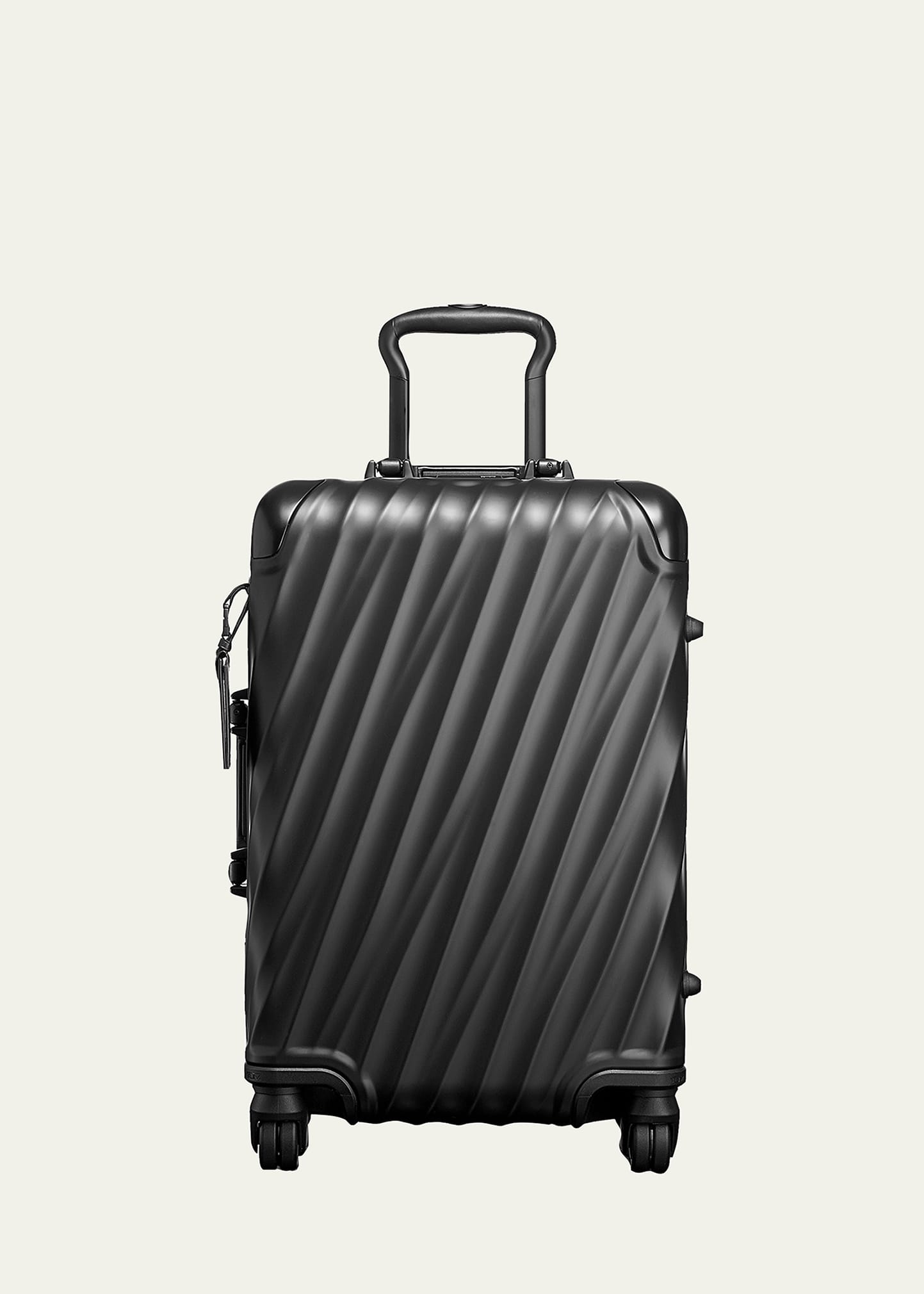 Hard-sided aluminum carry-on. Exterior features zip entry to main compartment, integrated TSA lock with replaceable pullers, three-stage telescoping handle system with push button, retractable top and side carry handle, and four dual-spinning recessed wheels. Interior features three zip pockets and tie-down straps. 14"W x 9"D x 22"T. Imported.