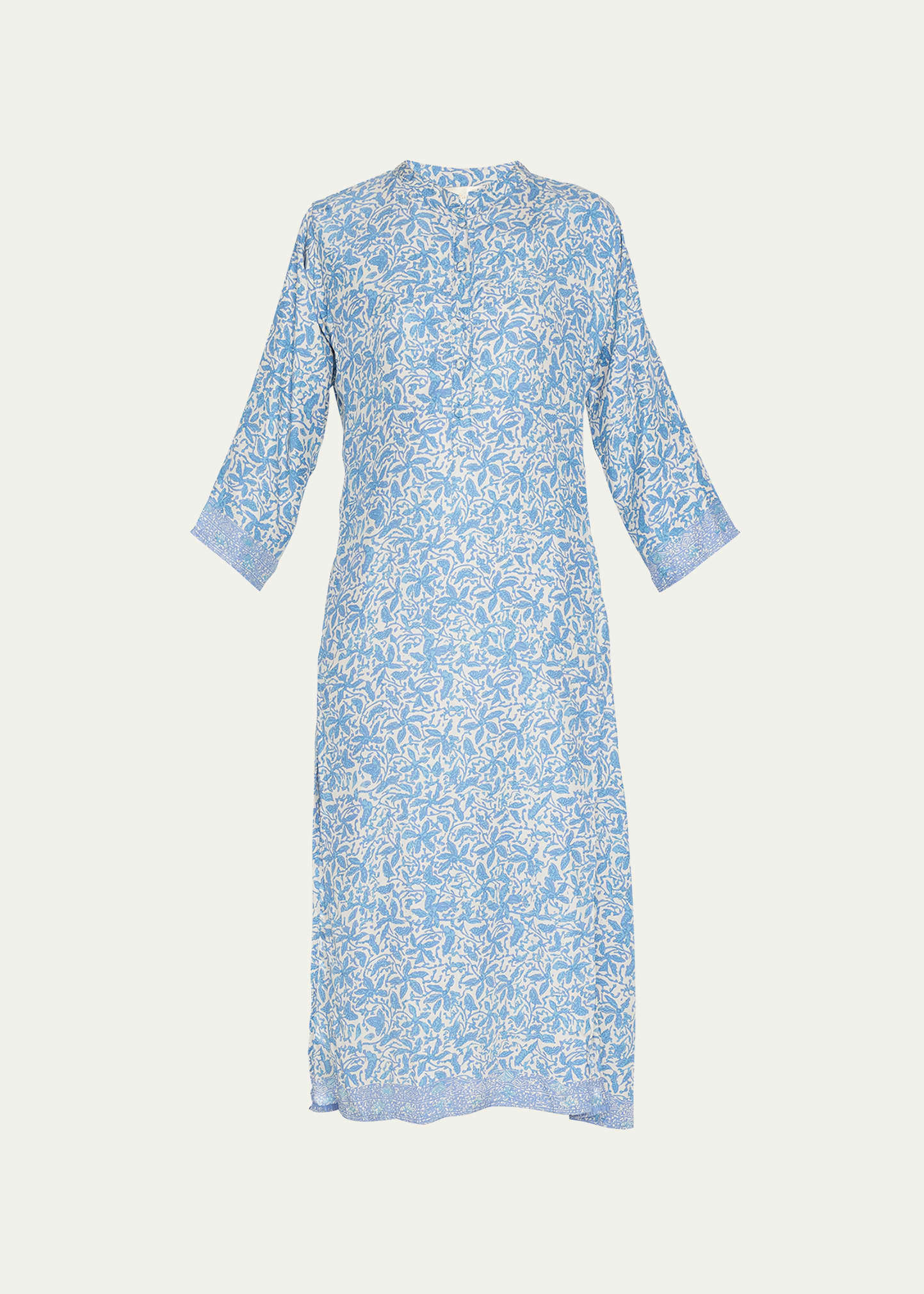 Natalie Martin "Isobel" floral-print dress with a covered button front Collarless neckline Three-quarter sleeves Thigh-high side slits Midi length A-line silhouette Silk Hand wash or dry clean Imported
