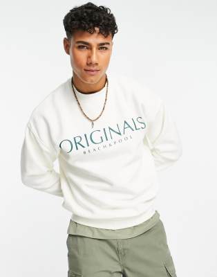 Jack & Jones Originals front print crew neck sweatshirt in ecru-White