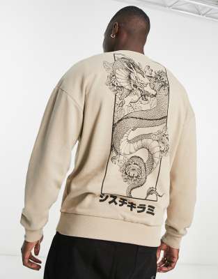 Jack & Jones Originals oversized sweatshirt with dragon back print in beige-Neutral