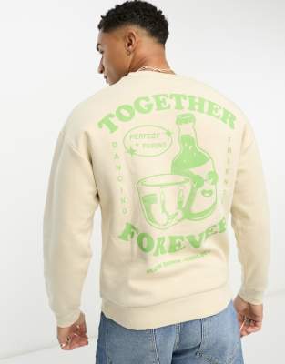 Jack & Jones Originals oversized sweatshirt with drinks back print in beige-Neutral