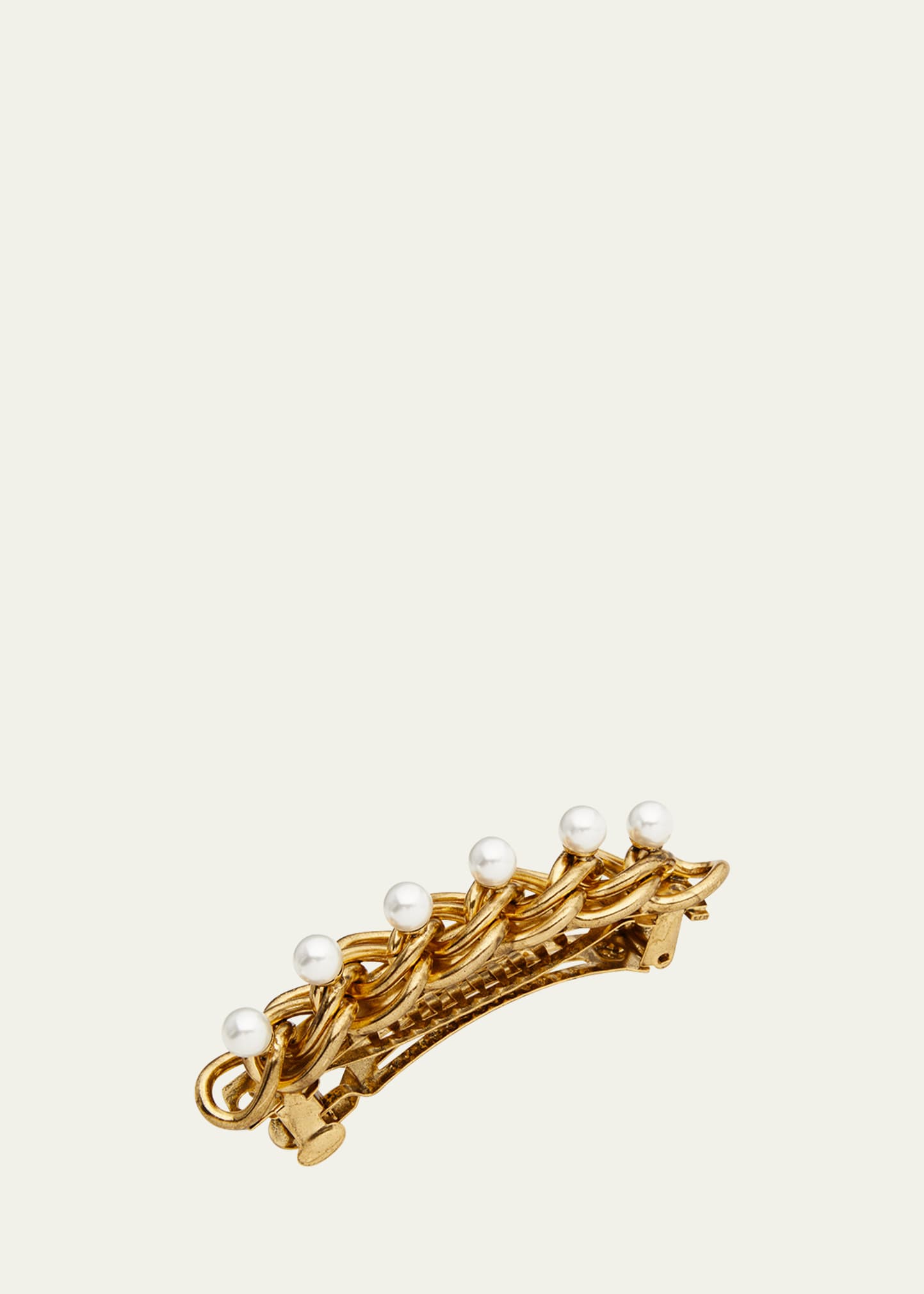 Lelet Ny "Jackie" French barrette in a chain link design accented with faux pearls Pinched clasp closure Brass/faux pearls/plastic Made in USA