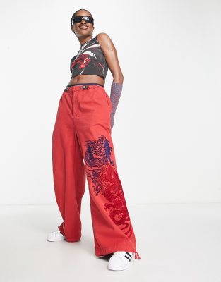 Pants & Leggings by Jaded London Style refresh: pending Low rise Elasticized waistband Press-stud details Textured dragon to leg Drawstring cuffs Oversized, tapered fit