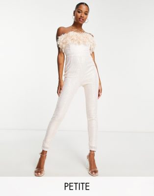 Jaded Rose Petite bandeau sequin jumpsuit with faux feather trim-White