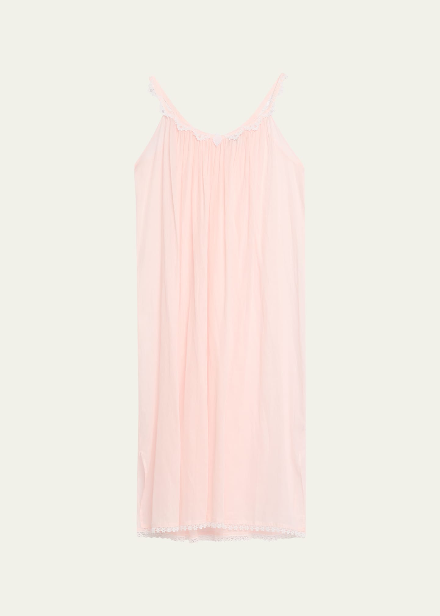 Celestine "Janina" ruched cotton nightgown with floral lace trim along the neckline and hem Scoop neckline Sleeveless Side slits at the hem Hem falls below the knee Shift silhouette Slipover style Cotton Machine wash Made in Germany