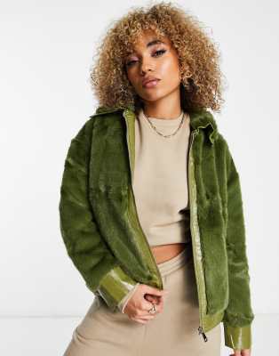 Jayley faux fur bomber jacket with faux leather trims in beige-Neutral