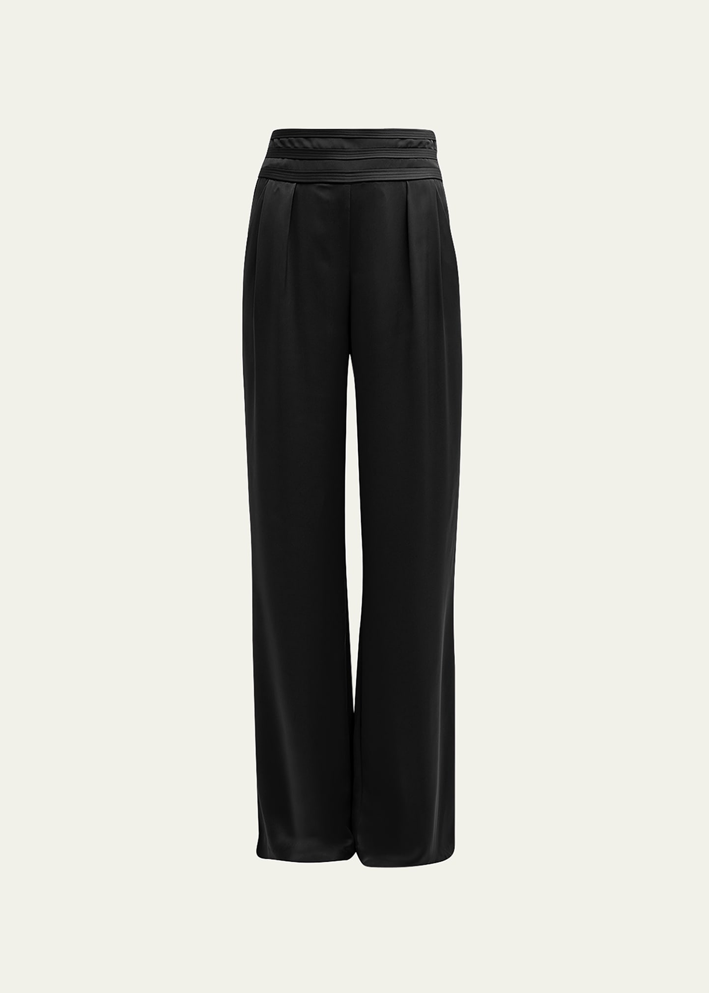Ramy Brook "Joss" trousers in a satin finish Approx. 33" inseam High rise Pleated front Slanted side pockets; back welt pockets Full length Wide legs Invisible side zip Polyester Imported