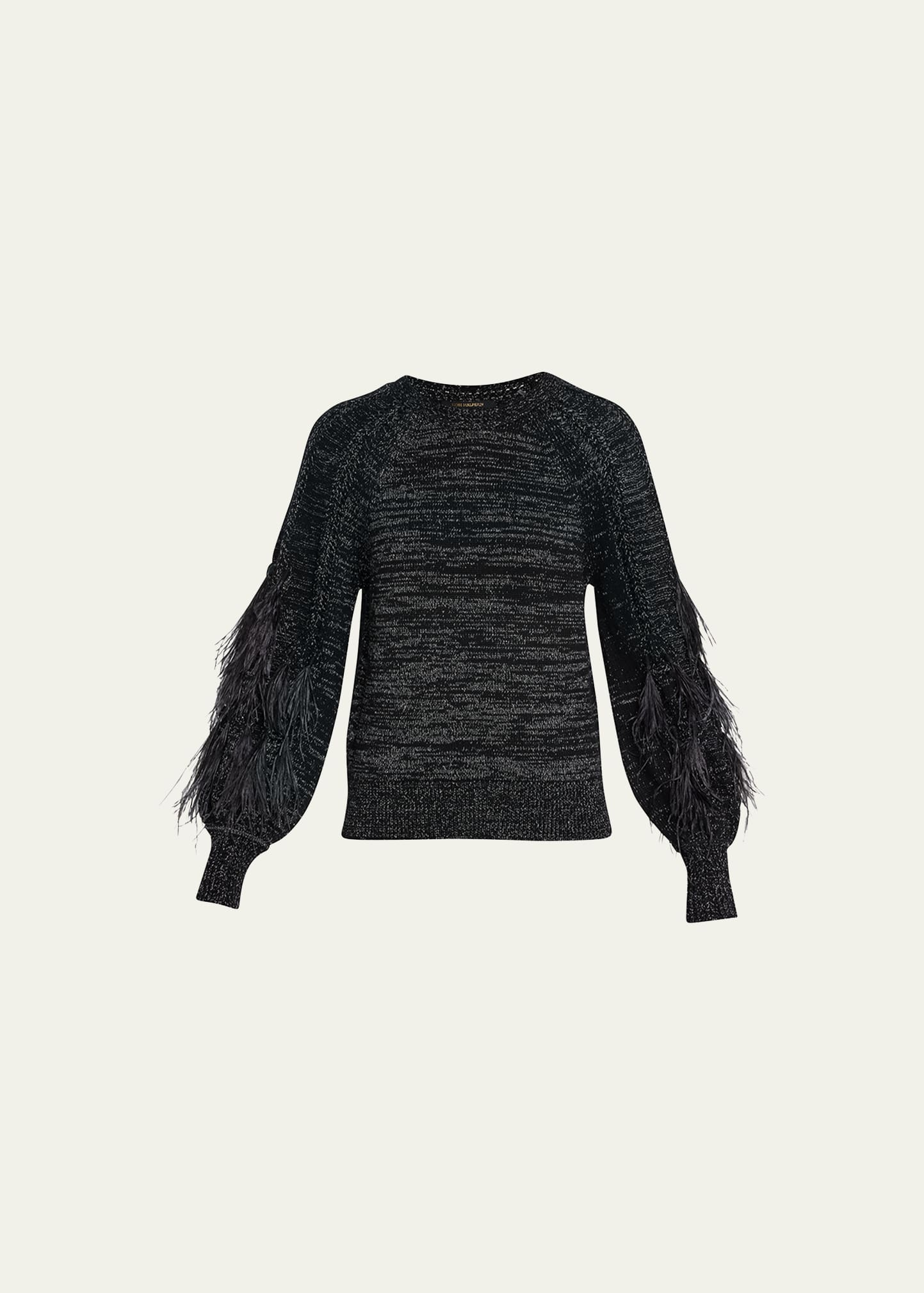 Kobi Halperin "Kai" knit sweater with feather fringe and open stitch details Approx. 22.5"L from shoulders to hem Crew neckline Long raglan sleeves Relaxed fit Pullover style Merino wool Imported
