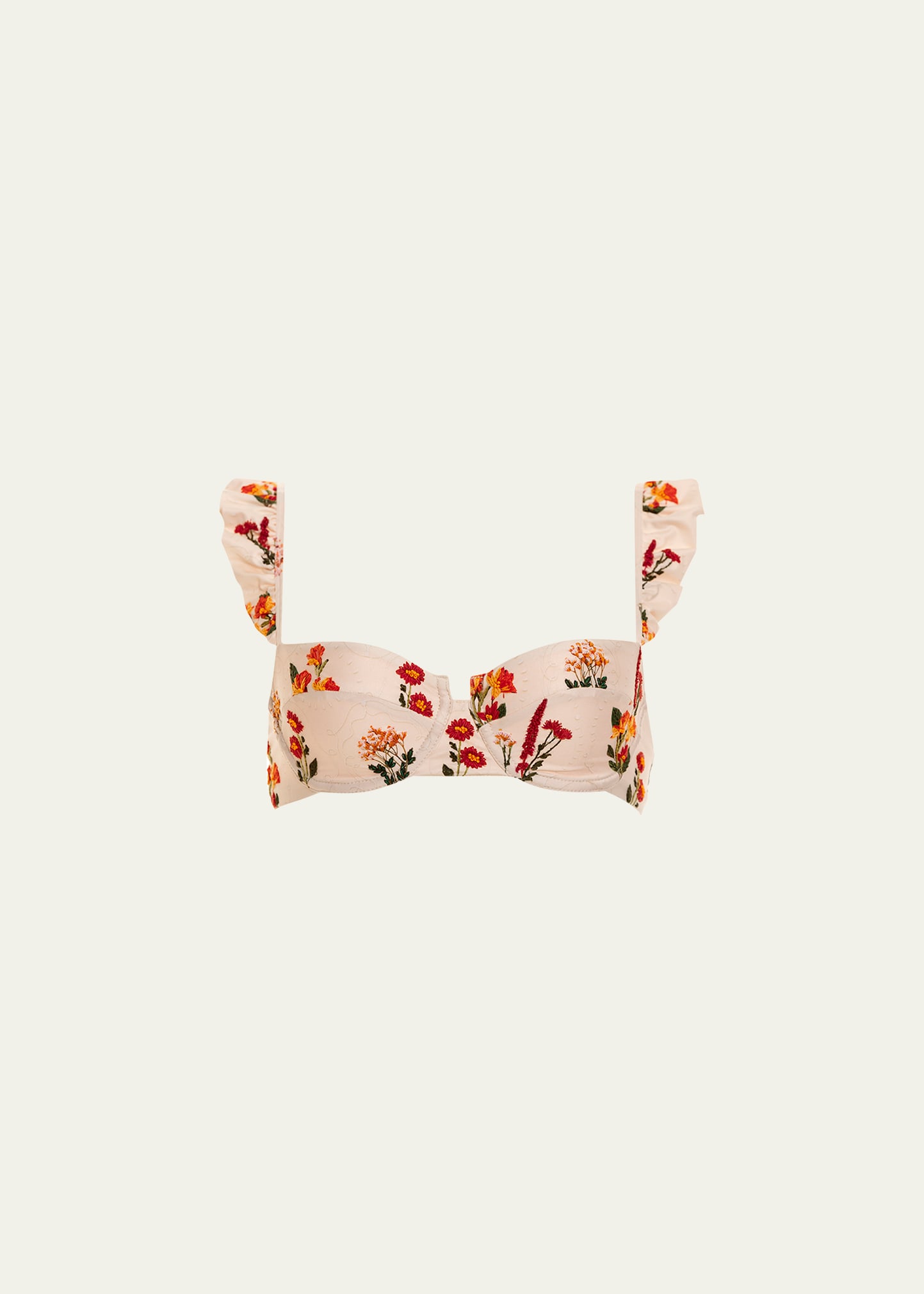 Agua by Agua Bendita "Kiwi" bikini top featured in Oasis floral print with feminine ruffled straps Sweetheart neckline Structured demi cups Built-in underwire Adjustable straps Mid-back clasps Elastane Made in Colombia Bottoms sold separately