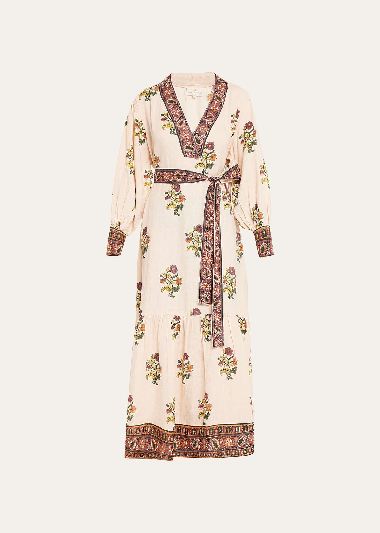 Hannah Artwear "Kiya" hand-dyed dress combines Buta Print with floral embroidery along the neckline, cuffs, and hem Plunge neckline Long sleeves; approx. 21.8"L Removable tie belt Tiered hem Maxi length A-line silhouette Linen Unlined Machine wash Imported
