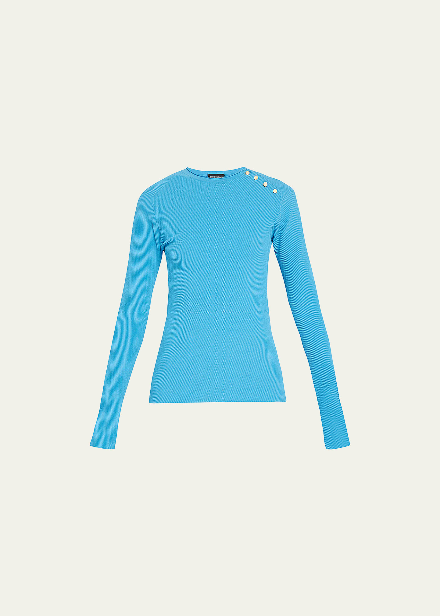 Giorgio Armani knit top with snap button details at the shoulder Crew neckline Long sleeves Hip length Fitted Pullover style Silk/silk Made in Italy