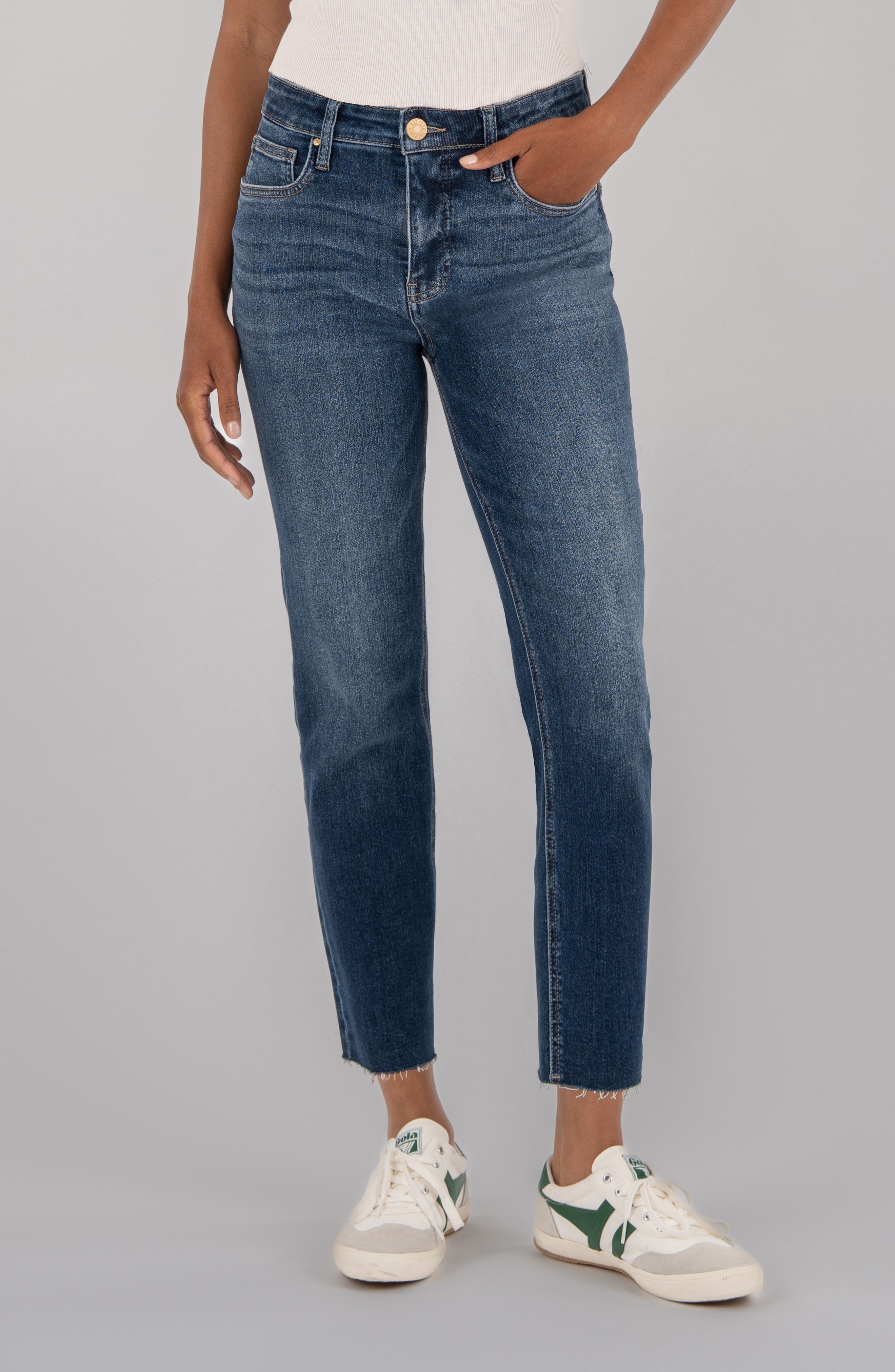 Tapered to mimic '90s styles, these high-rise jeans are made from soft, faded stretch denim and end in raw-cropped hems. 26" inseam; 13" leg opening; 10 1/4" front rise; 13" back rise (size 8) Zip fly with button closure Five-pocket style 94% cotton, 5% polyester, 1% spandex Machine wash, tumble dry Imported