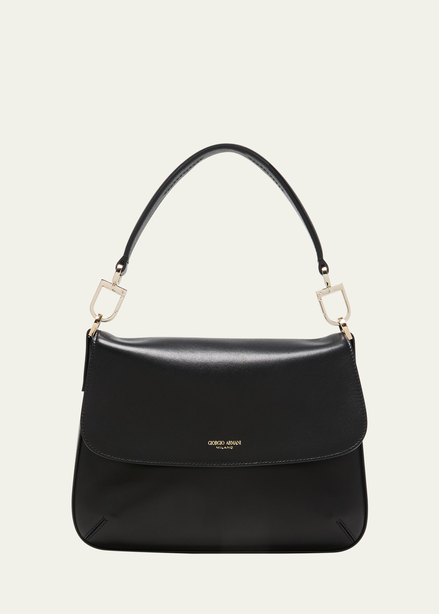 Giorgio Armani shoulder bag in soft leather Heat-stamped logo at front Detachable top handle Detachable adjustable shoulder strap Can be styled as a top handle or shoulder bag Flap top with magnetic closure Exterior, one slip pocket Interior, one flat pocket, one zip pocket Suede lining Approx. 9.1"H x 11.42"W x 2.6"D Made in Italy
