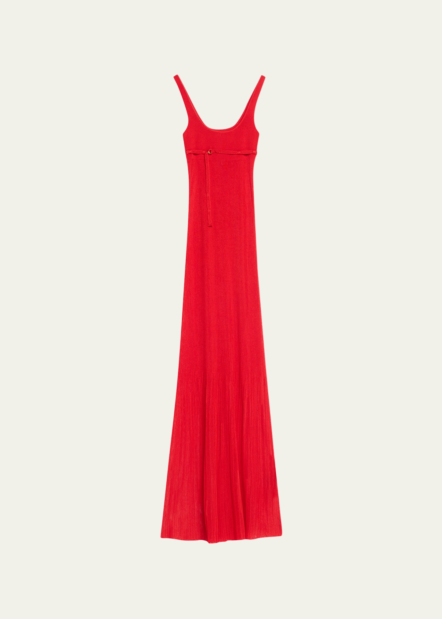 Jacquemus "La Robe Maille Oranger" semi-sheer maxi dress features a belted detailing at the bust Scoop neckline Sleeveless Full length Bodycon silhouette Polyester/polyester/nylon/polyamide Hand wash or dry clean Made in Italy