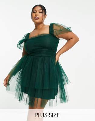 Lace & Beads Plus off shoulder tiered structured mini dress in emerald green